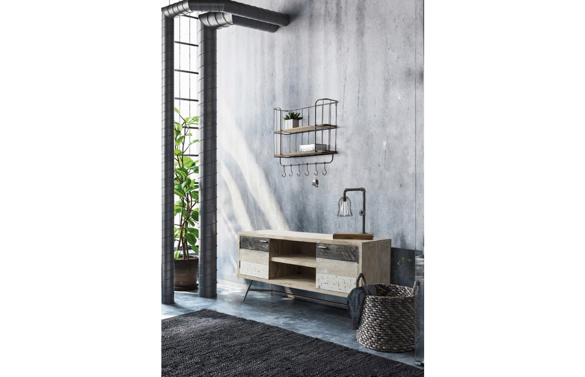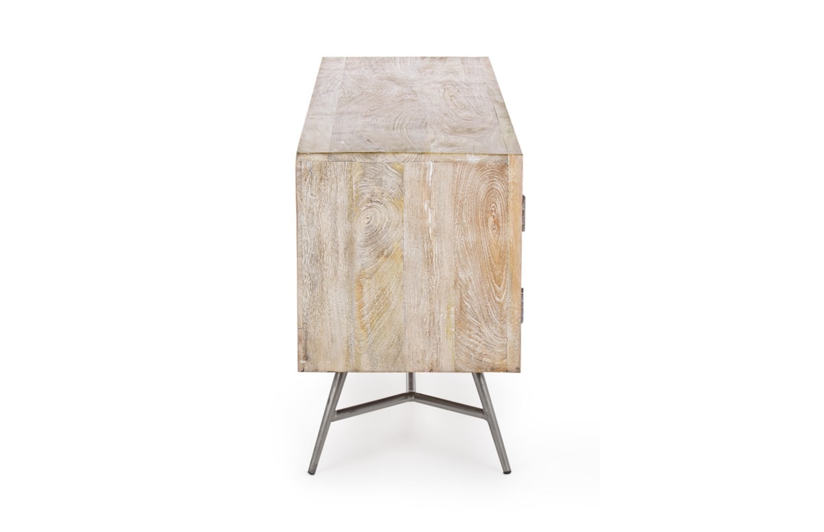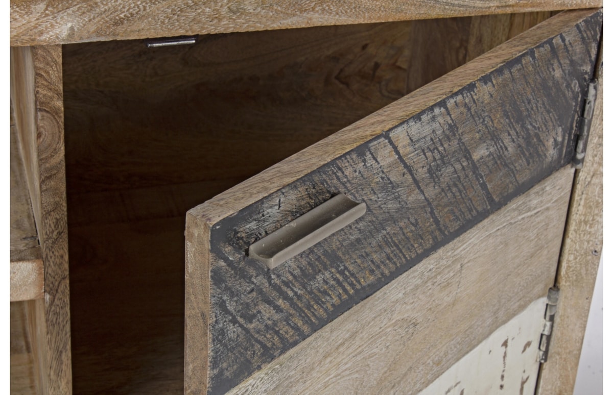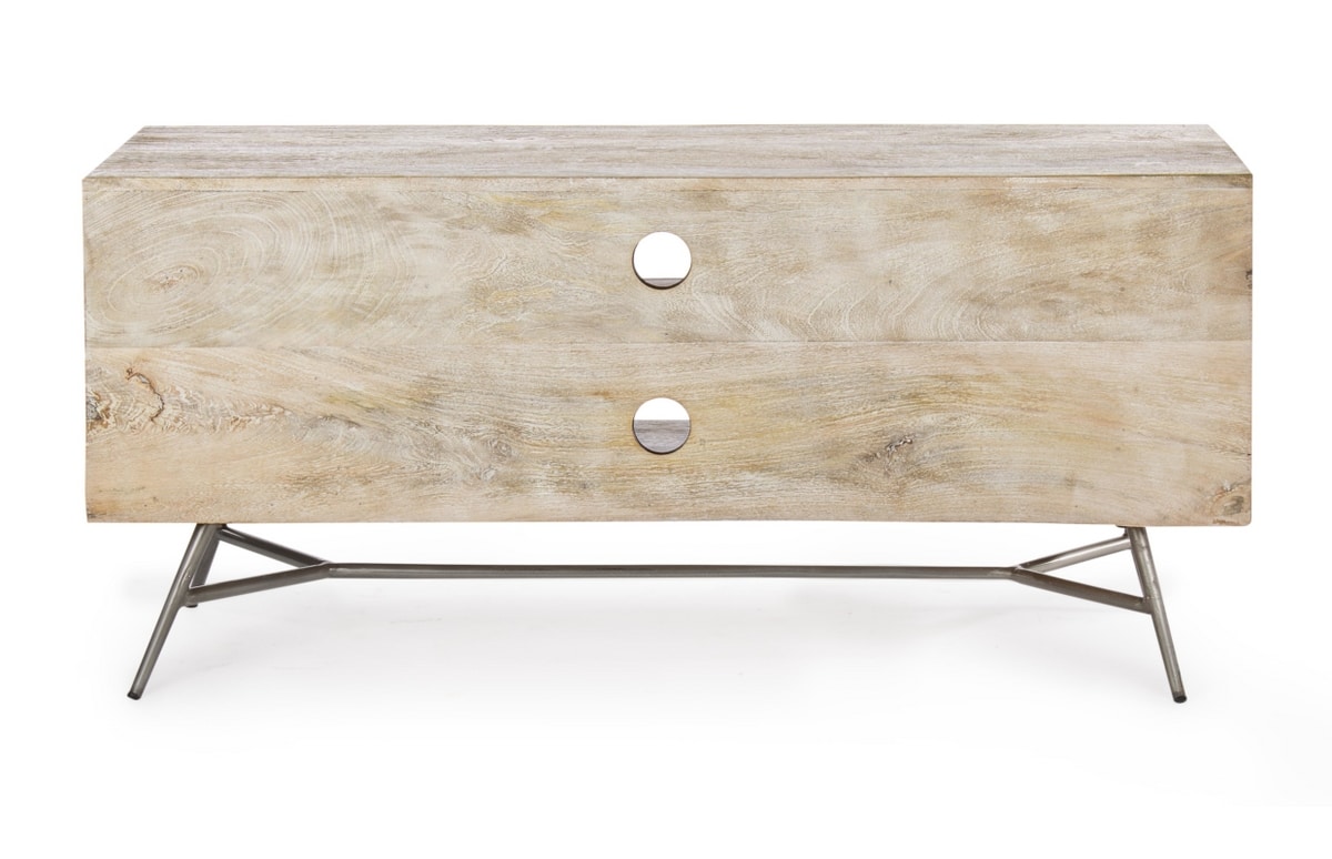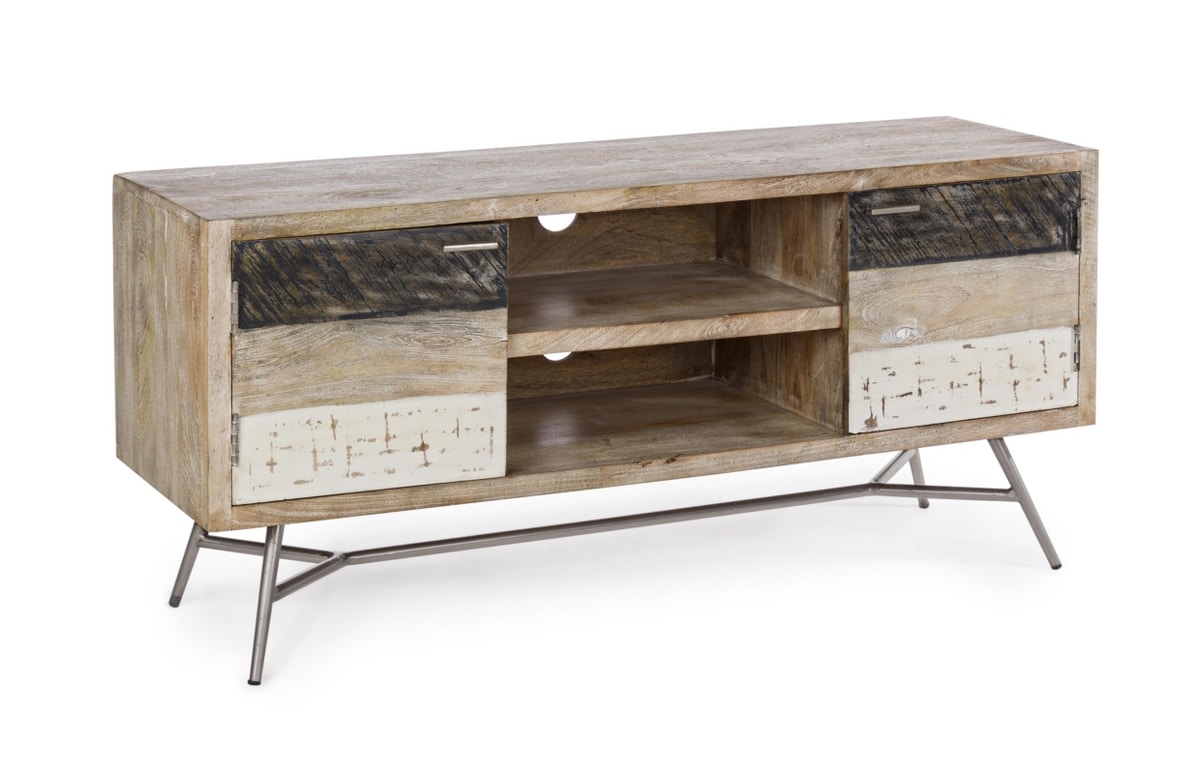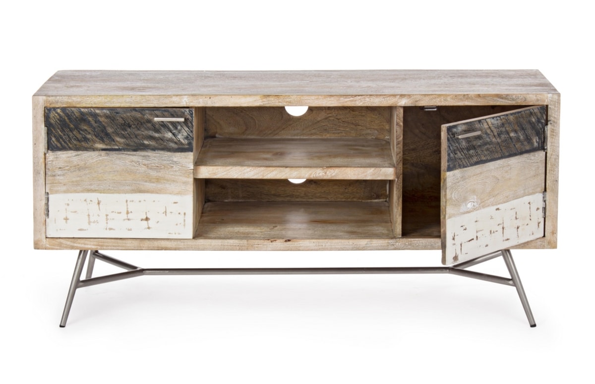 Mobile basso, porta tv, con struttura in legno di mango, piedini da assemblare in ferro. Maniglie in metallo. Finitura a base di nitrocellulosa.