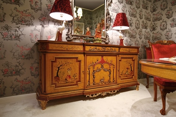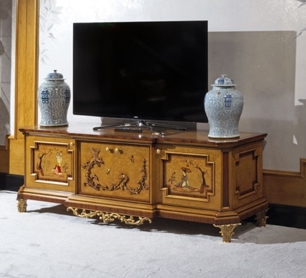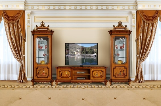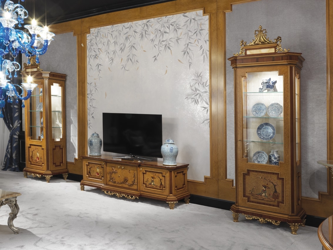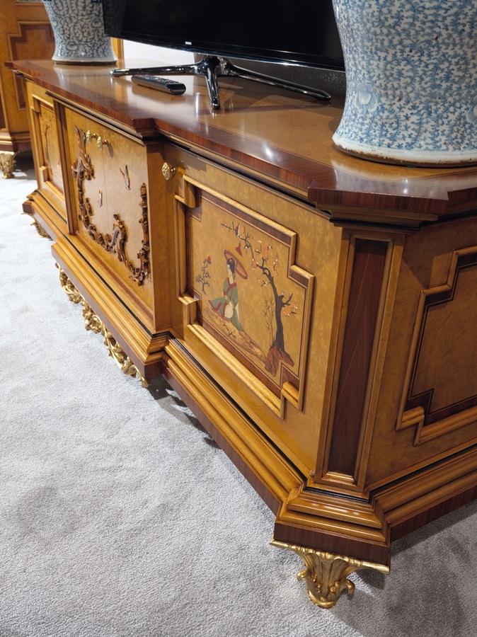 Per chi cerca un ambiente in stile cinese di lusso, proponiamo questo mobile porta TV in radica di mirto, con inserti in zebrano. Gli intarsi e gli intagli creano un capolavoro di alta ebanisteria. La finitura è in ciliegio con oro e nero. La sala da pranzo è composta dal mobile TV e dalla vetrina che può essere realizzata in diverse dimensioni 1/2/3 ante mantenendo lo stesso stile e la stessa eleganza.