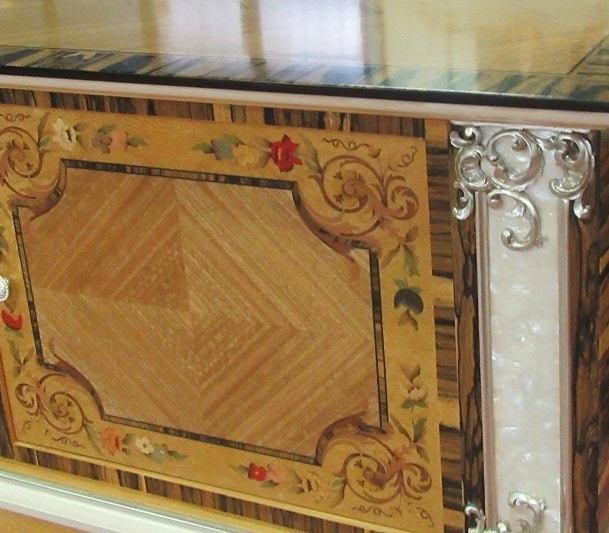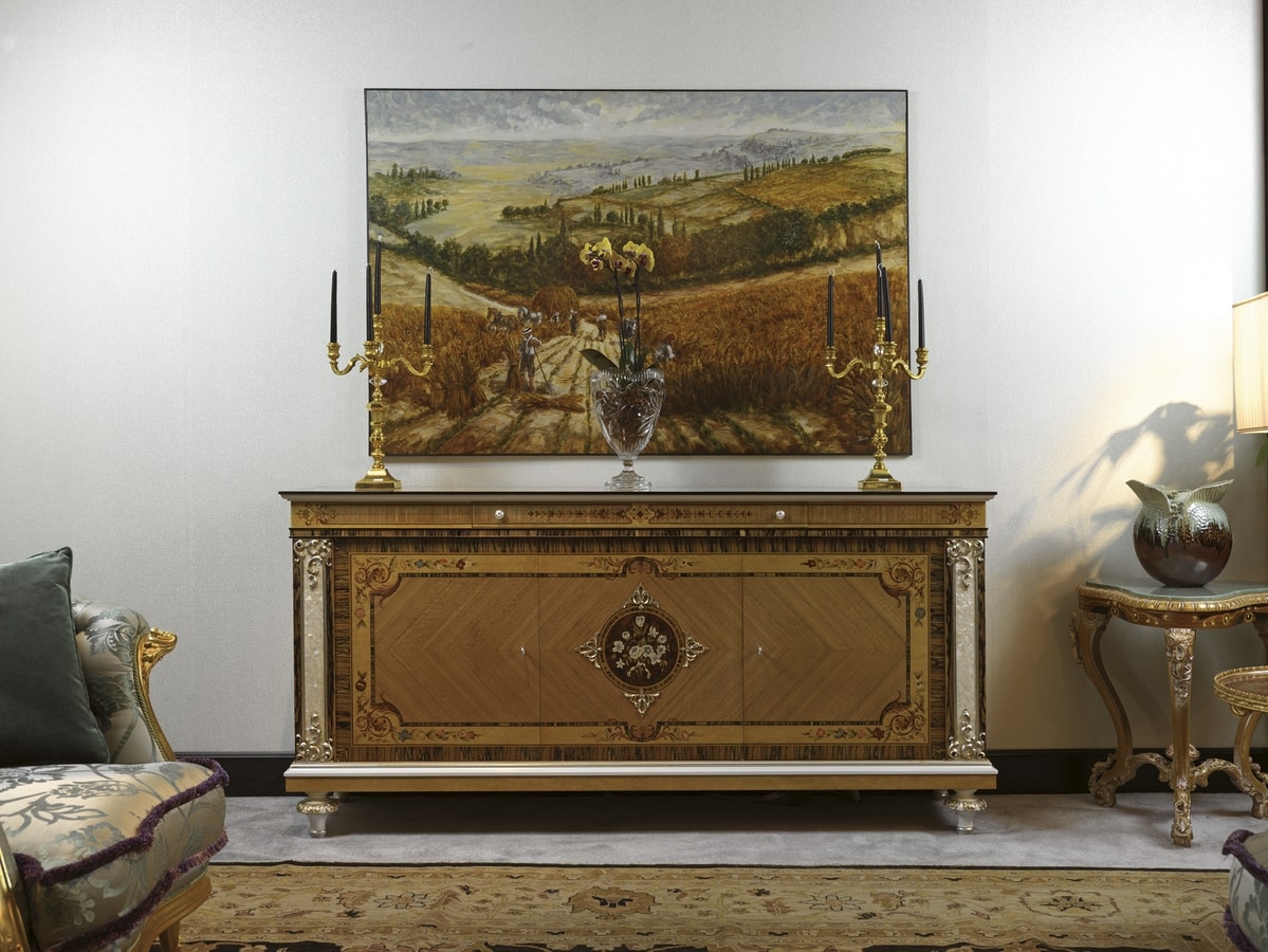 Richiedi prezzi Prodotti similiMobile porta TV di lusso in radica di madrona ed eucalipto frisè con inserti in ebano bianco, madreperla ed intarsi. Dettagli in finitura laccata madreperla con argento. La sala da pranzo è ricca di elementi che la compongono, dal mobile porta TV alle vetrine, per arricchire ogni spazio dell'ambiente.