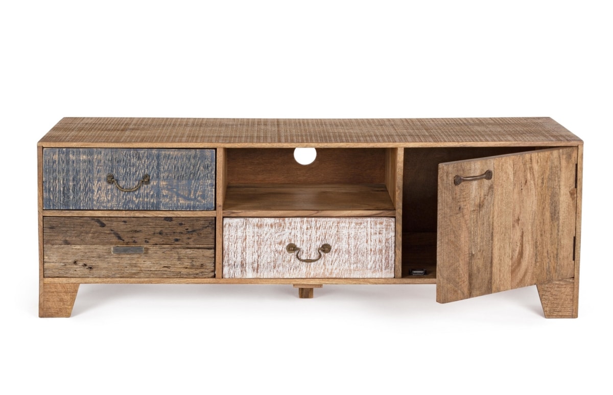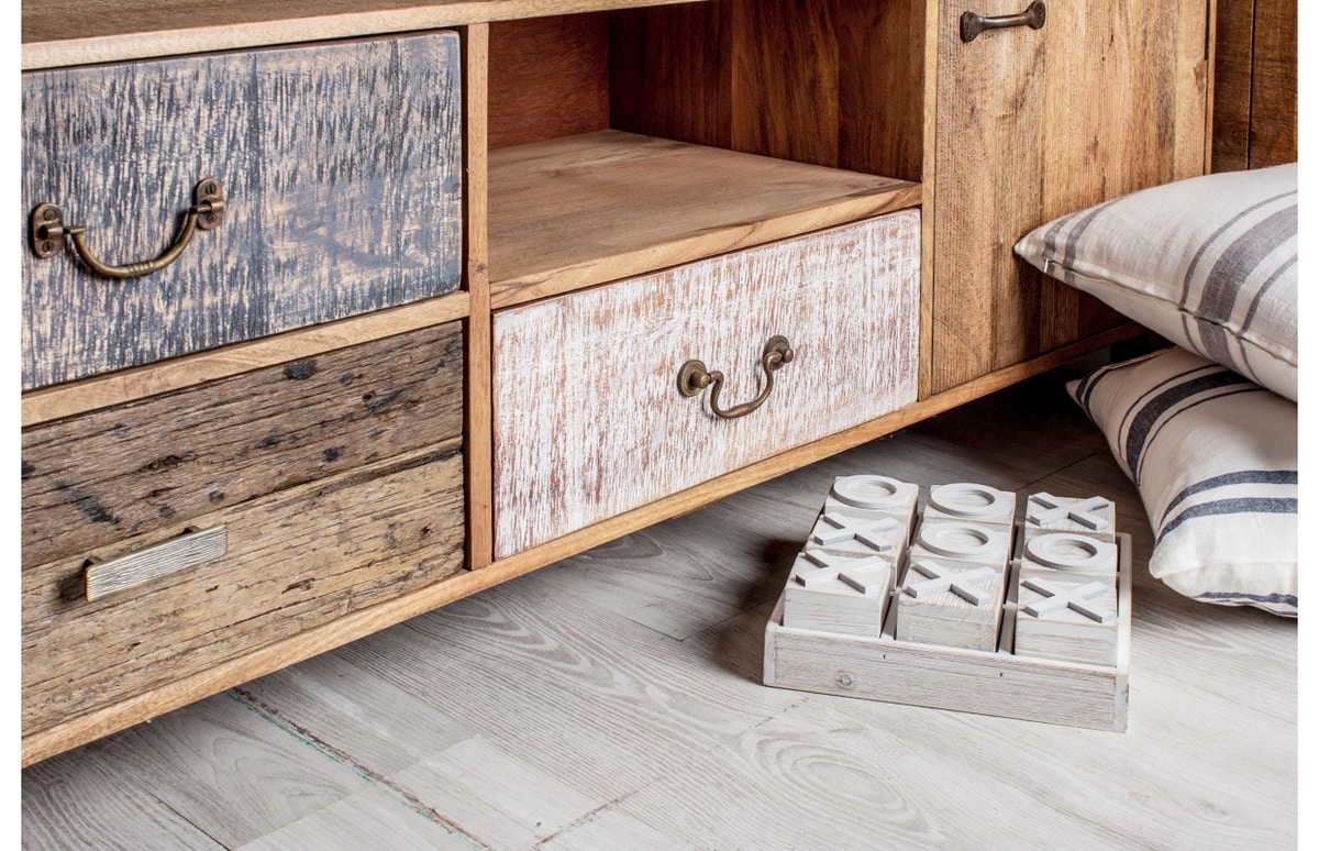 Mobile porta tv country, con struttura in mango, schienale e fondo cassetti in compensato. Maniglie in metallo. Finitura rustica naturale con vernice a base d'acqua.