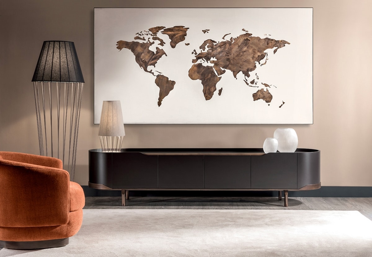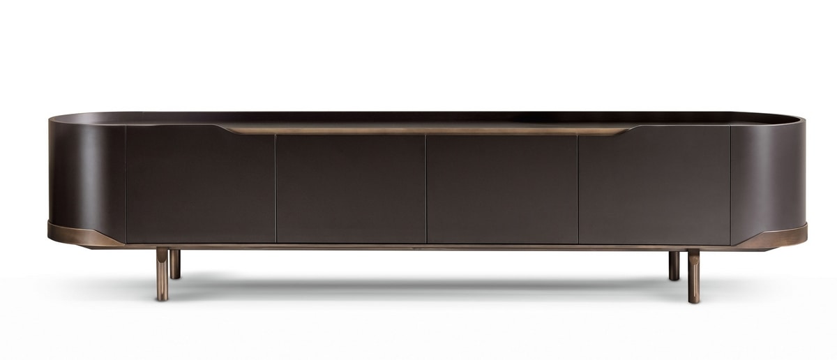 Oasi madia porta TV a quattro ante ha fianchi in legno curvato e la base in acciaio a spessore curvato e tagliato a laser.