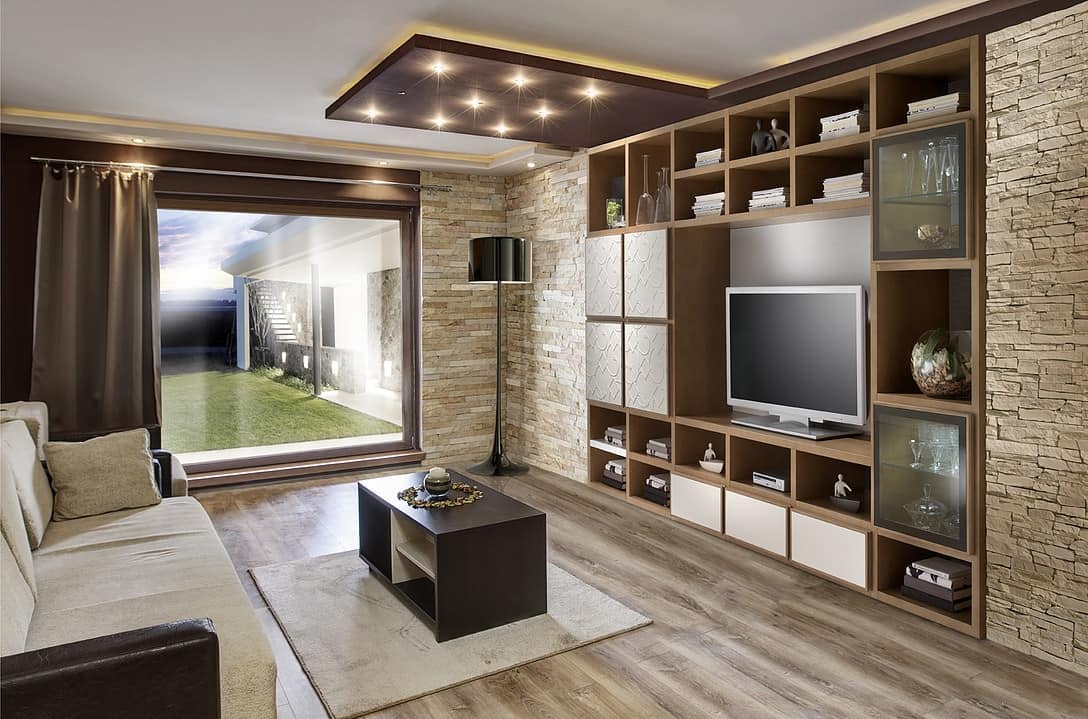 Porta TV con libreria, con decorazioni in rilievo in noce