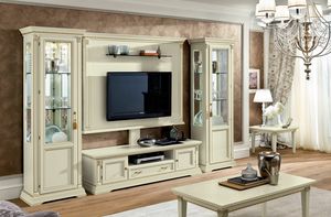Parete tv dalle linee classiche, ideale per arredare salotti lussuosi, con dettagli in foglia oro