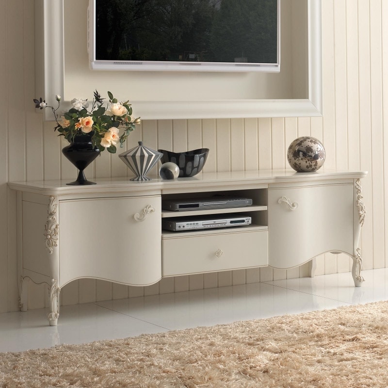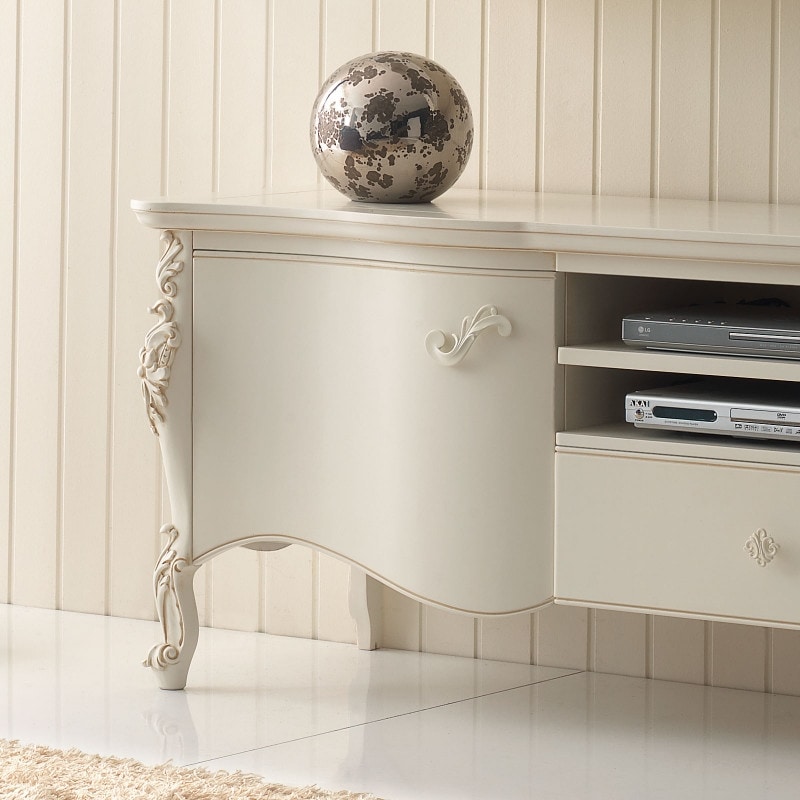 Richiedi prezzi Prodotti similiElegante e raffinato portatelevisore con due ante, un cassetto centrale e due vani a giorno nella parte centrale. Spalle sagomate con evidenti intagli, piano sagomato con cornice e base alzata da terra da piedini che terminano a ricciolo. Questo portatelevisore è destinato ad una casa esclusiva e di classe. Le forme delicate ma importanti sono decorate da dettagli riccamente intagliati. Questo portatelevisore può essere inserito all’interno di un arredamento classico oppure in un contesto moderno, come forte elemento di contrasto. Si tratta certamente di un mobile destinato a durare negli anni.