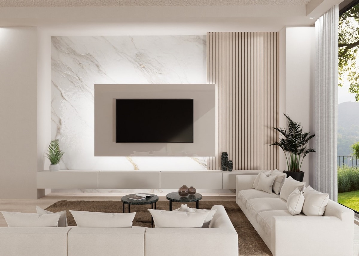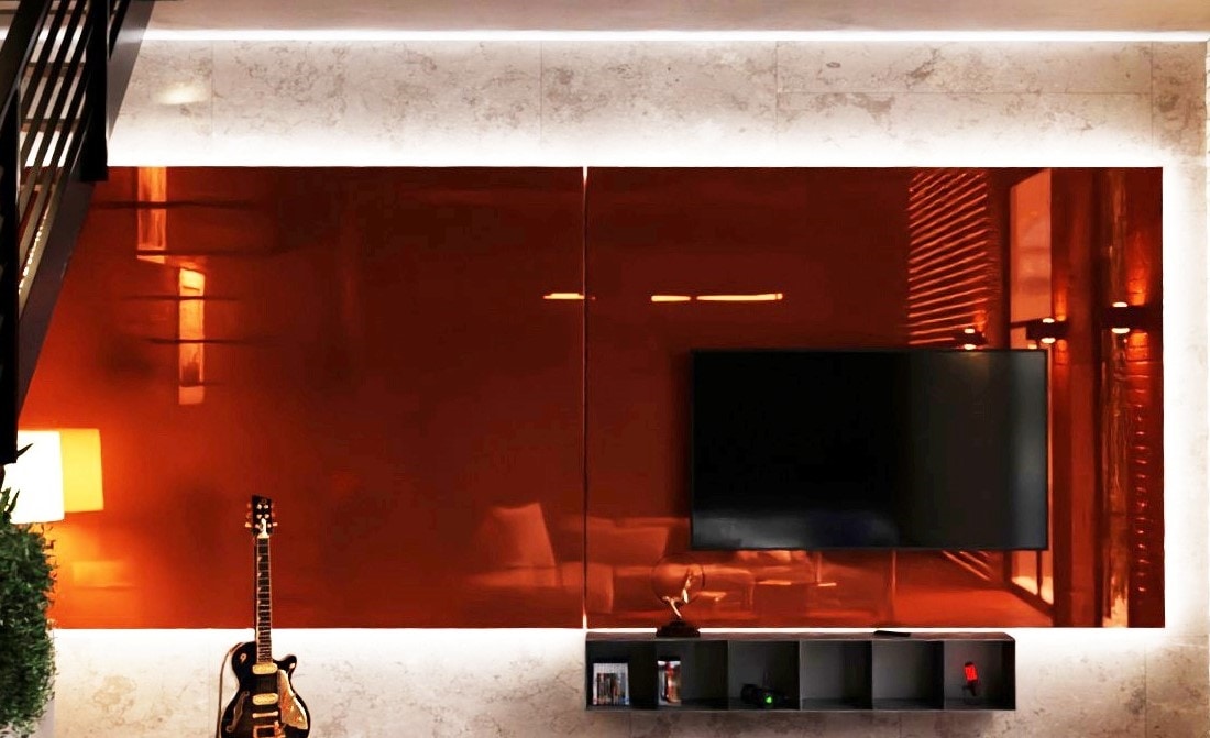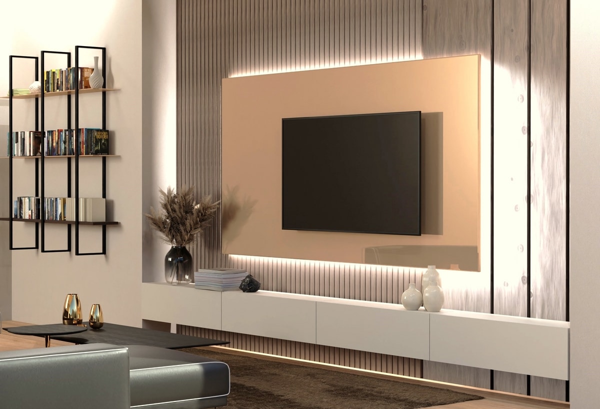 Schienale retro tv in cristallo 6mm temperato colorato cat.D/E lucido o satinato antimpronta. Retropannello in melaminico sp.20mm con squadrette regolabili per fissaggio a muro e con spazio centrale per passaggio cavi. Staffa centrale porta tv orientabile fino a 180°. Optional illuminazione led perimetrale