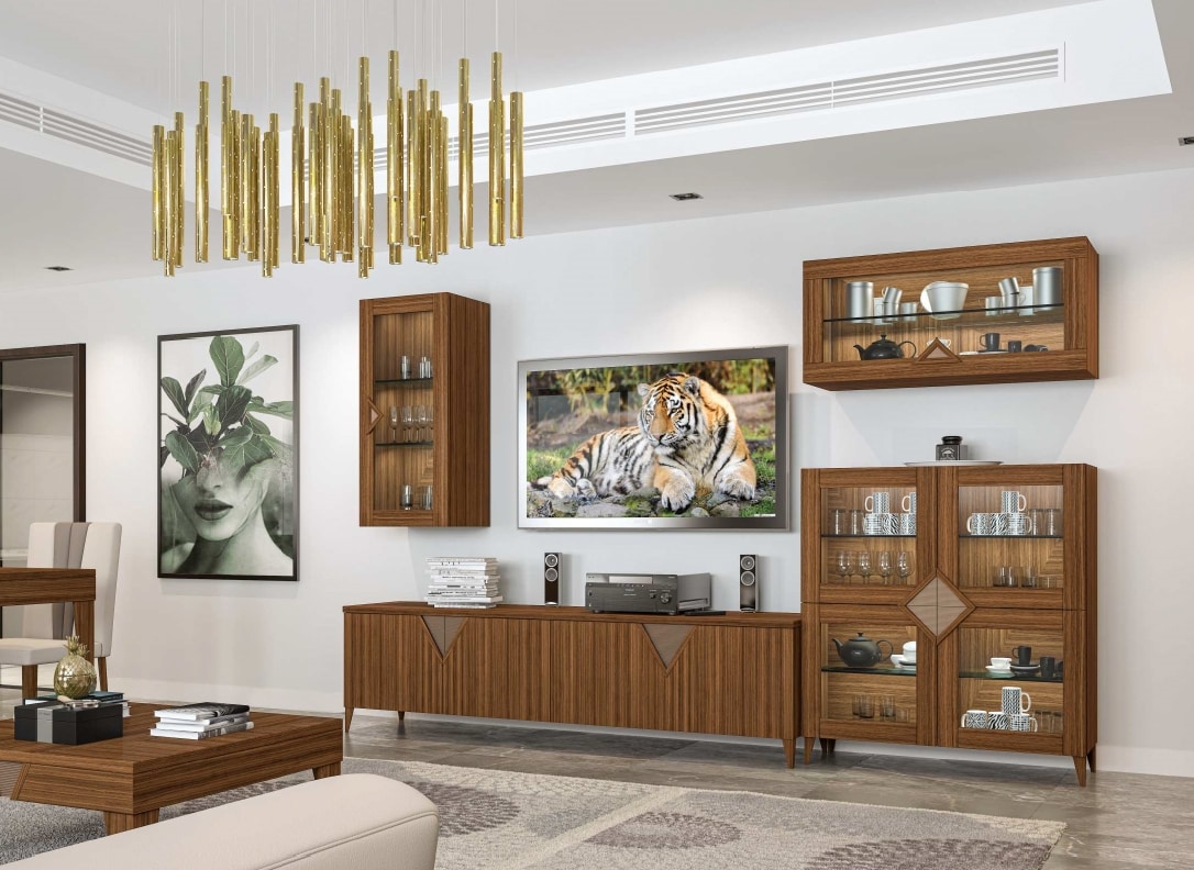 Mobili da salotto in legno noce canaletto. Composizione con vetrine pensili.