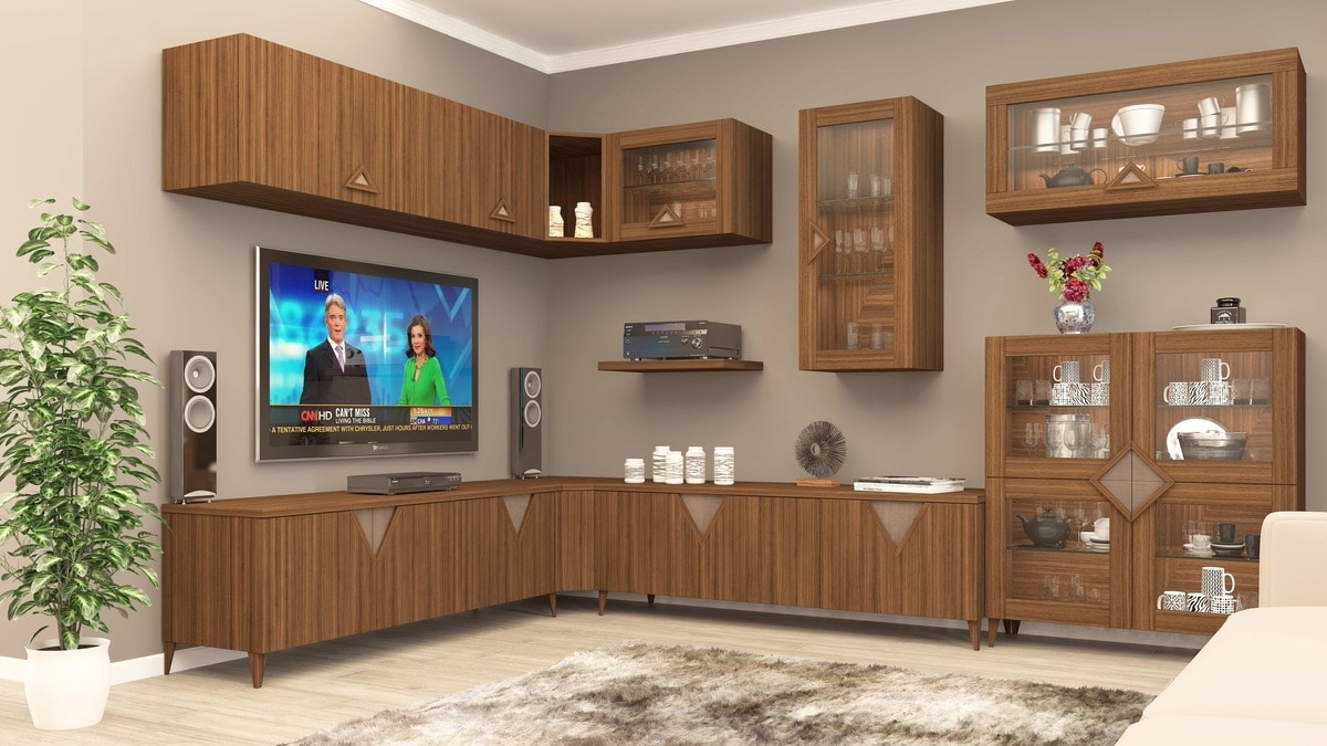 Mobili da salotto in legno noce canaletto. Composizione angolare con vetrine pensili.