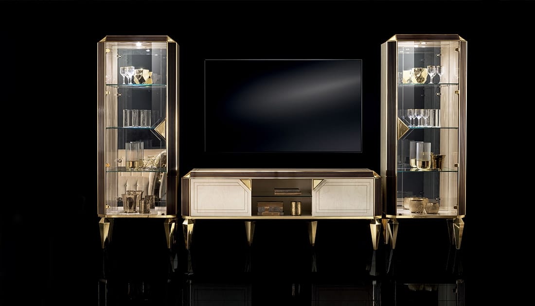 Gli elementi della zona giorno esprimono a pieno le caratteristiche fondamentali della collezione Diamante. Le linee sobrie ma ben marcate delle cornici in finitura olmo generano l’intreccio geometrico che dà origine al leitmotiv di tutta la collezione: un elegante triangolo che richiama le sfaccettature del diamante che va a incastonarsi agli spigoli delle vetrine. Lo stesso elemento si ripropone anche nel mobile orizzontale a cui si abbinano le gambe nell’innovativo materiale TECRES® a finitura cromata in oro.