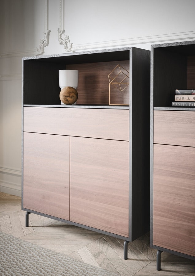 Sistema giorno dalle personalità multiple, Evo contiene, organizza, può fungere anche da solida base. Il segreto è nella sua struttura, forte, elementare, versatile. Riempita di elementi diversi e con differenti funzioni – ante, cassetti, vani a giorno – scopre vocazioni e appendici anche fuori da sé, diventando fulcro operativo della stanza.