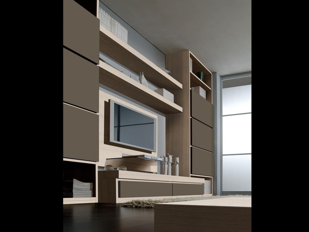 Sistema modulare per soggiorno, dotato di libreria, ante e porta TV.