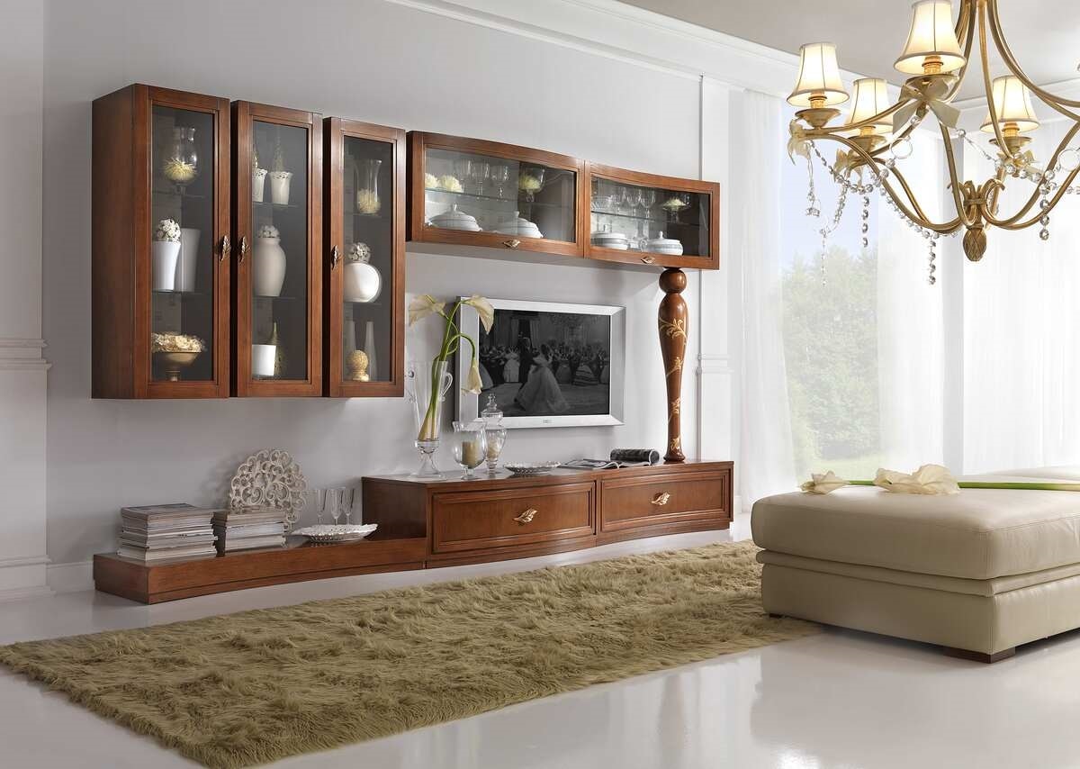 Mobile da soggiorno componibile, finitura noce con decori oro.