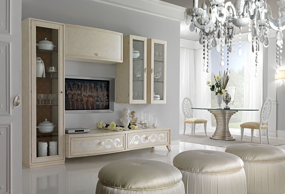 Mobile da soggiorno componibile, con elementi pensili e vetrina.