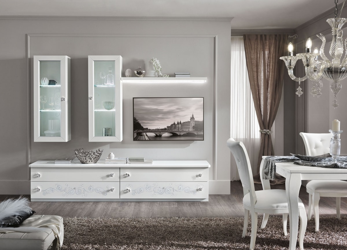 La nostra composizione parete giorno dal design contemporaneo è un’ottima soluzione per rinnovare e diversificare la tua zona giorno! Curata nei dettagli, dal decoro eseguito a mano ai particolari swarosky!