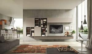 Mobile per ampia parete soggiorno, con pannellatura boiserie