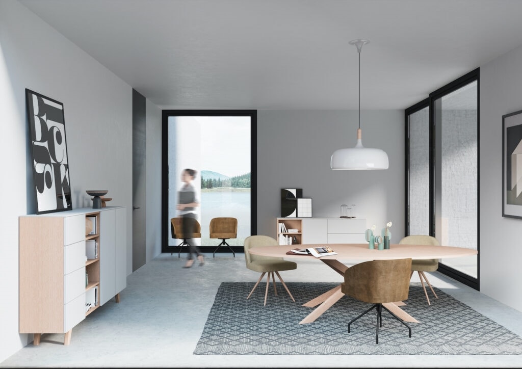 Richiedi prezzi Prodotti similiSistema giorno componibile con piano in legno (rovere o noce), fenix, hpl o ceramica e piedini a scelta (da 5 a 17 cm) in legno o metallo. Ante con apertura push-pull e cassetti con sistema Blumotion ammortizzato. Possibilità di ante e cassetti in fenix o hpl.