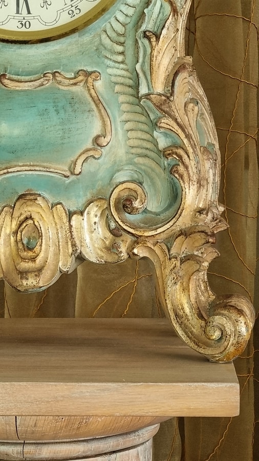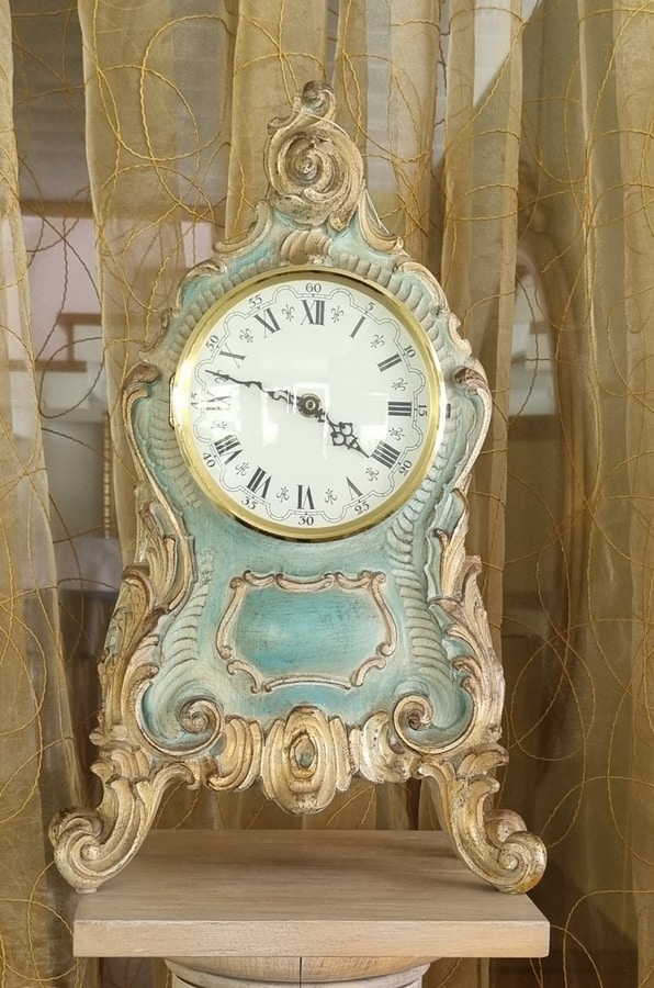 Sveglia in legno intagliata a mano. Meccanismo a batteria / pila. Finitura laccata con particolari in foglia oro.
