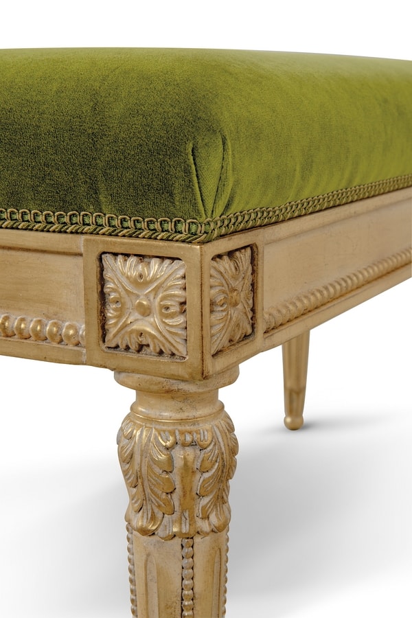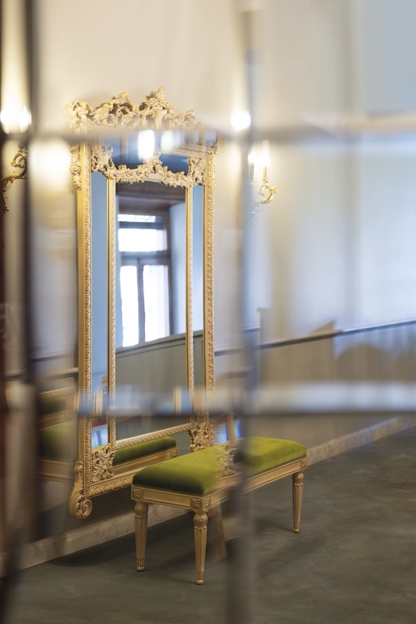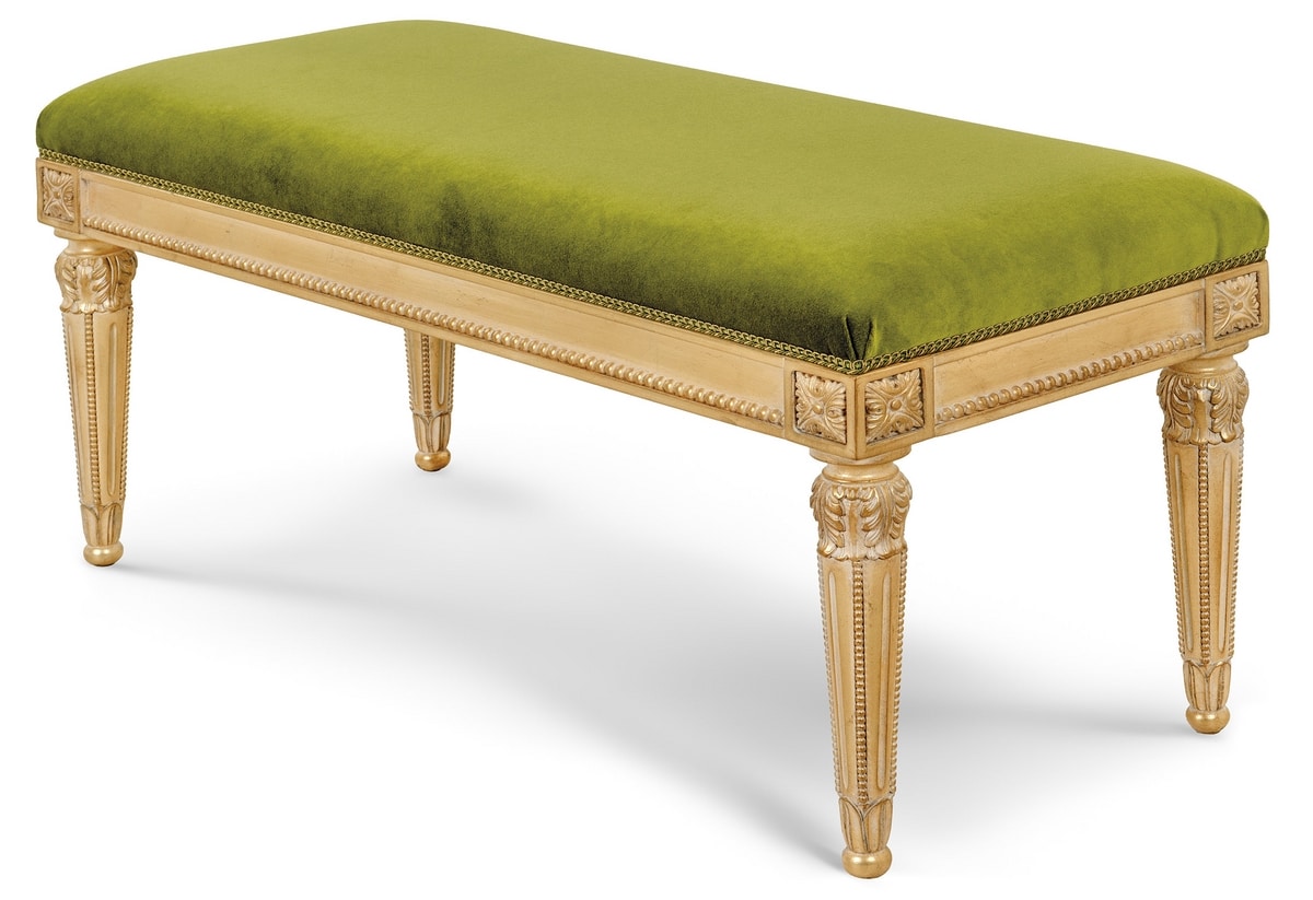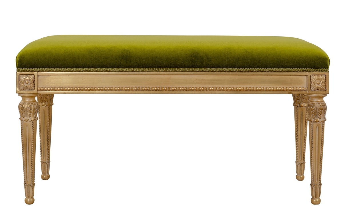 Panca con gambe e fascia scolpite a mano, impreziosita da delicati motivi intagliati e una lavorazione a perle lungo il profilo. La struttura è rifinita con finitura OCH: una patinatura in foglia oro con fondo bianco meringa che dona luminosità e profondità alle superfici. L’imbottitura, rivestita in velluto verde, conferisce un tocco di colore e raffinatezza, mentre la passamaneria completa la composizione con cura sartoriale.