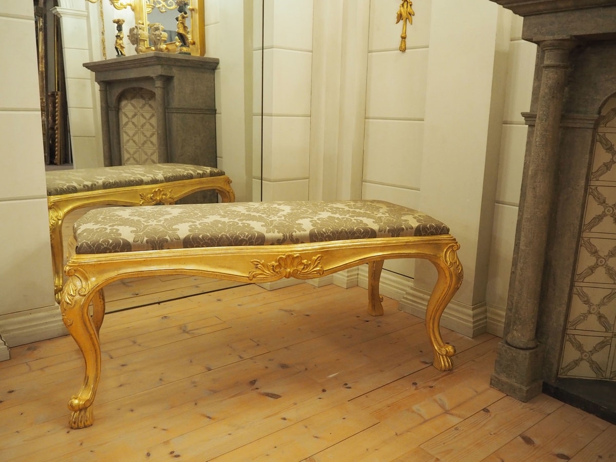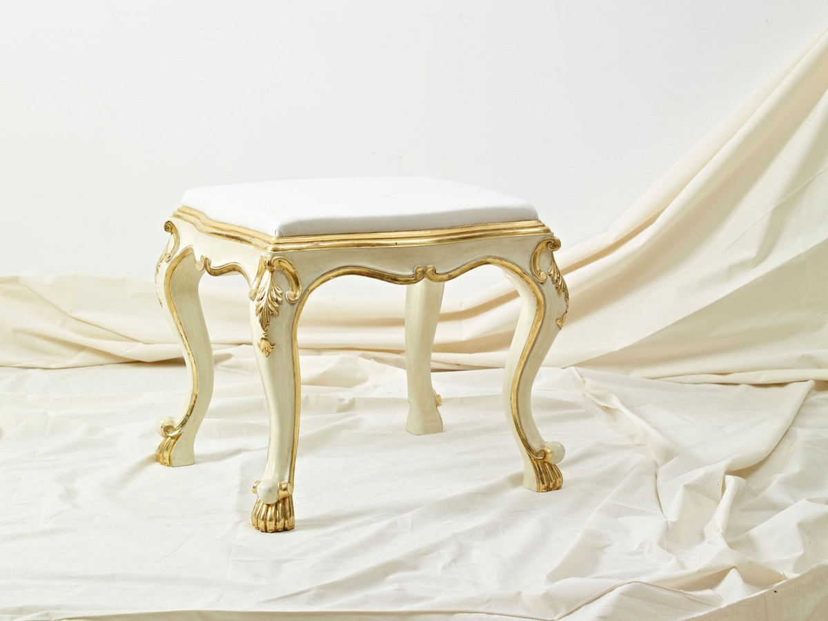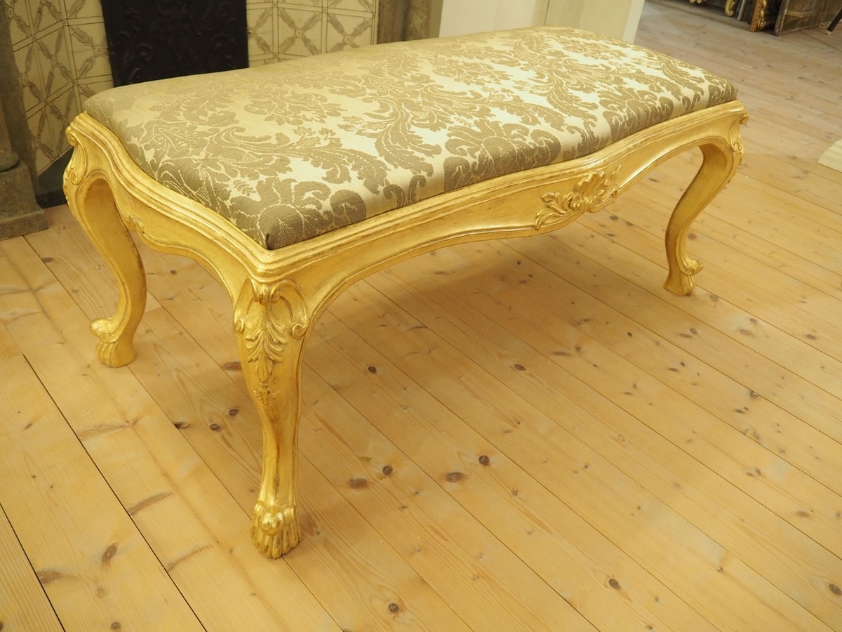 Richiedi prezzi Prodotti similiPanchetta (SD 0013) del ‘700 Veneziano, con seduta imbottita e gambe sagomate, prodotta artigianalmente, intagliata a mano in legno di tiglio e dorata a guazzo in foglia oro.