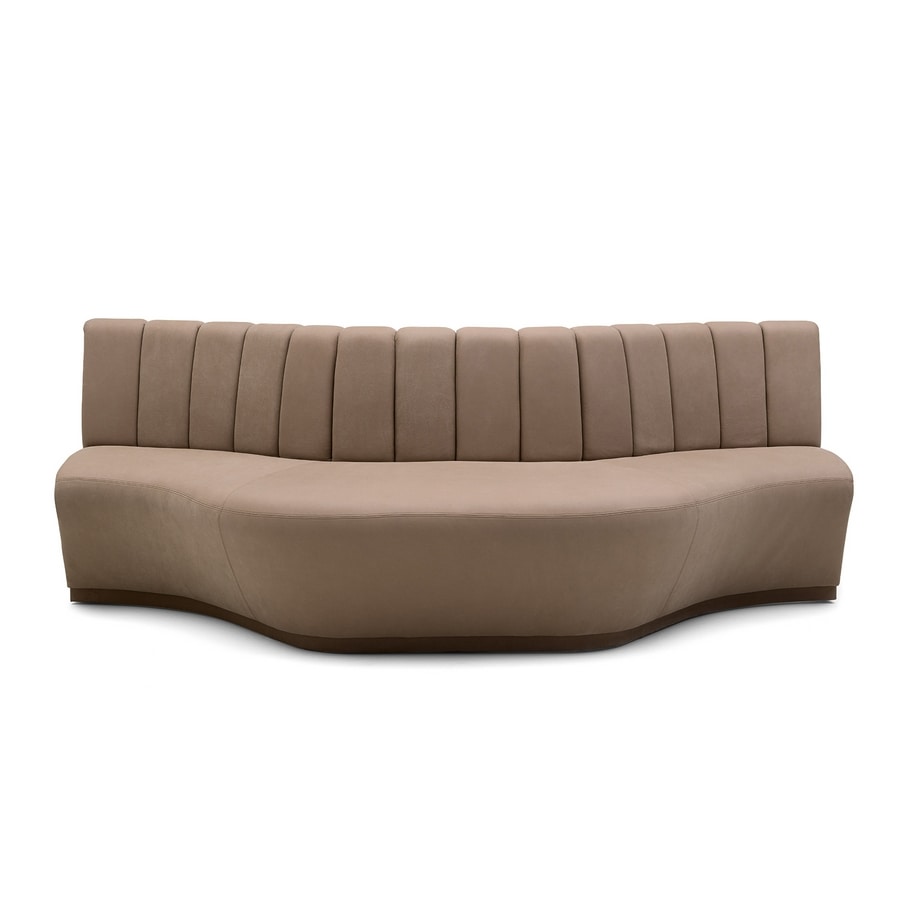 Panca curva di grandi dimensioni con schienale trapuntato e profilo anteriore sagomato. Doppia profondità di seduta. Zoccolo in laminato. Retro non tappezzato.
