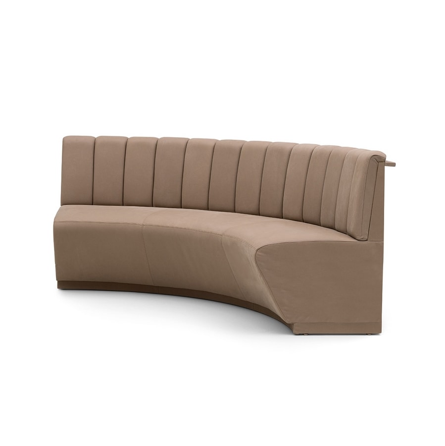 Modulo curvo con schienale trappuntato. Zoccolo in laminato. La struttura permette un'installazione flessibile in configurazione a semicerchio o serpentina. Retro non tappezzato.