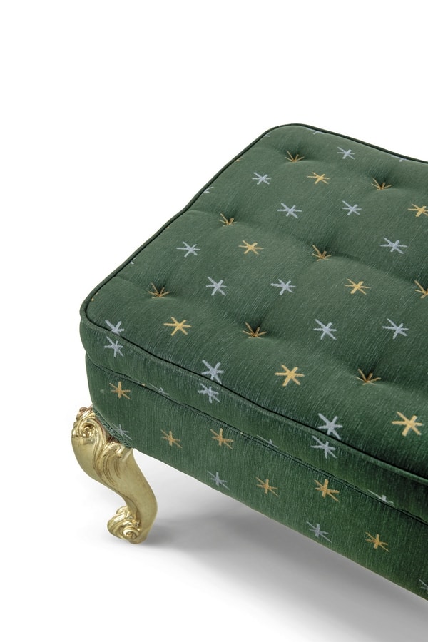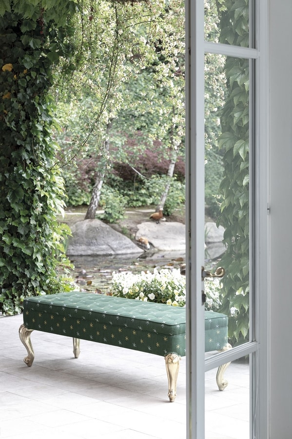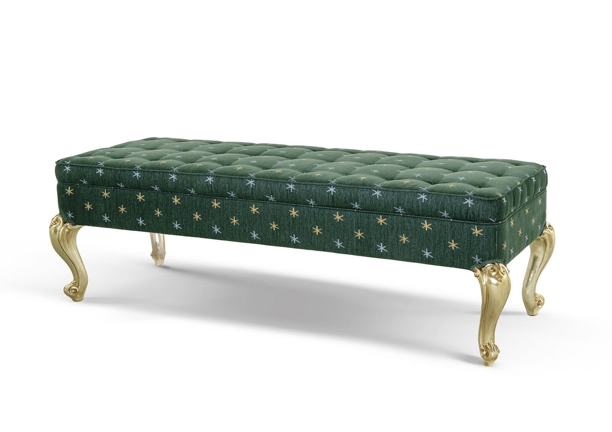Panca con gambe intagliate, imbottita in tessuto, finitura a foglia Silver Gold.