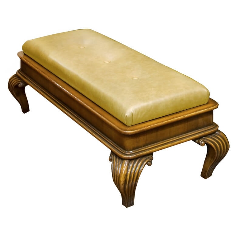 Panchetta con base impiallacciata in piuma di noce, gambe sagomate intagliate con gole che ne sottolineano la curva e seduta imbottita a capitonné.