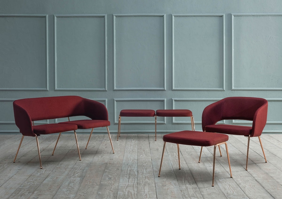 Panca con struttura in metallo, schienale imbottito in ecopelle (tessuto spalmato) o in tessuto.