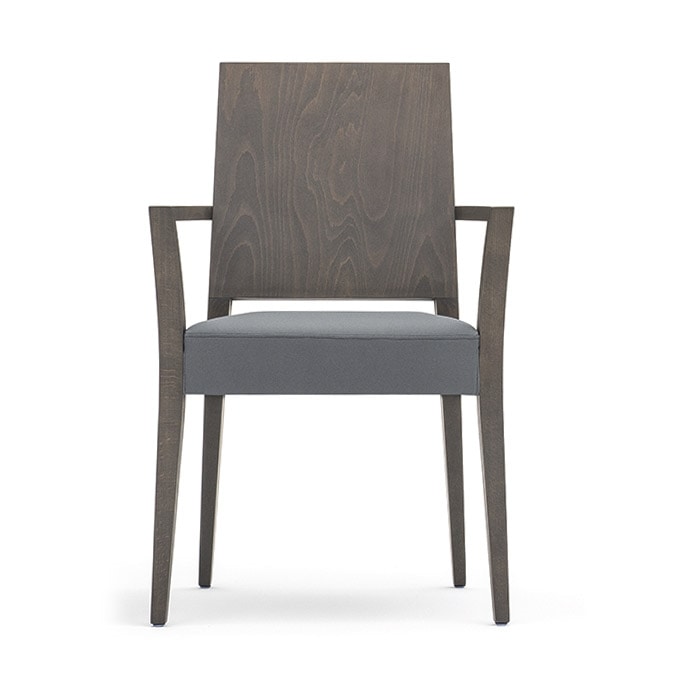 Collezione dalle forme pulite, rigorose e moderne. Comprende sedia, poltrona e sgabello perfettamente impilabili. I forti spessori assicurano il massimo della robustezza. Struttura in legno di faggio, schienale tamburato e sedile con rivestimento in tessuto o pelle. Tappezzeria fatta su fusto sfoderabile su richiesta. Finitura standard ed a campione.