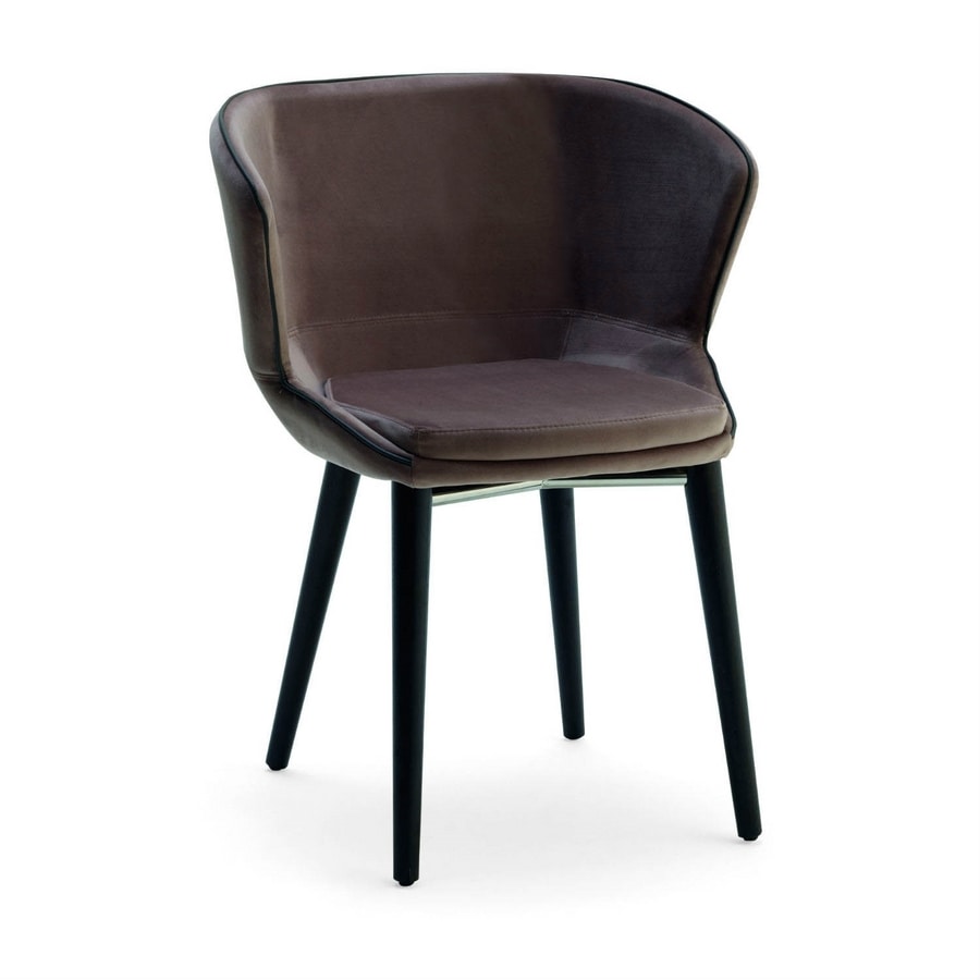 Poltroncina con struttura in legno, sedile e schienale imbottito in ecopelle (tessuto spalmato), o in tessuto, o in abbinamento di tessuto-pelle.