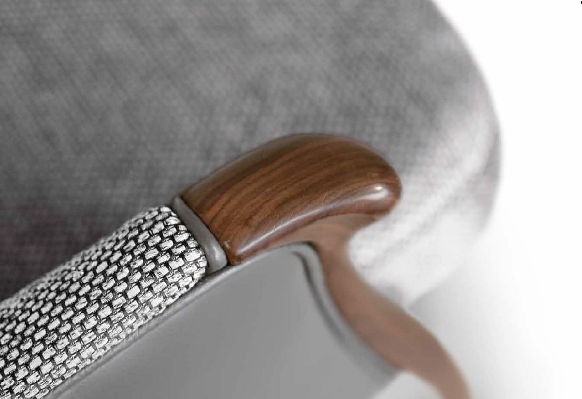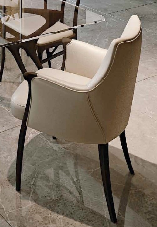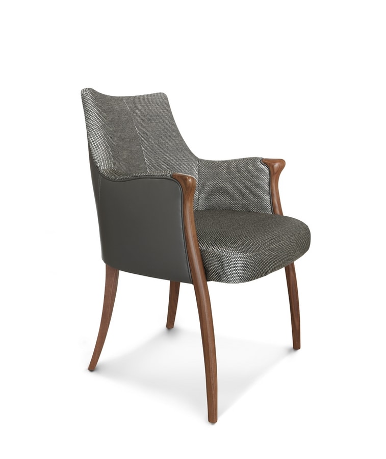 La poltroncina DEMETRA rivestita in pelle e tessuto. Da sola è capace di unire design e confort insieme, alla sedia FEBE rende il tavolo adattabile anche ad ambienti di lavoro lussuosi. Disponibile in diverse finiture.