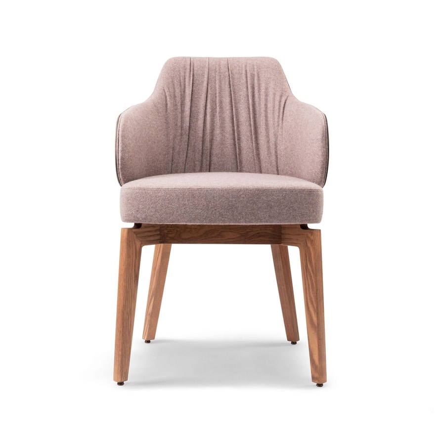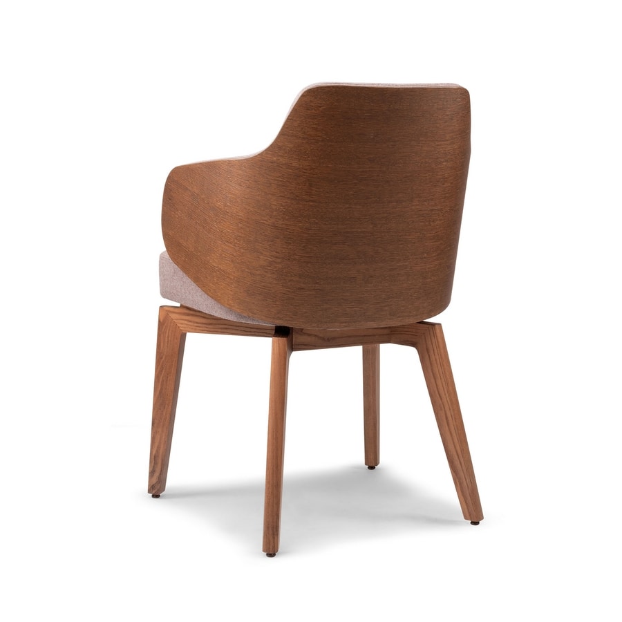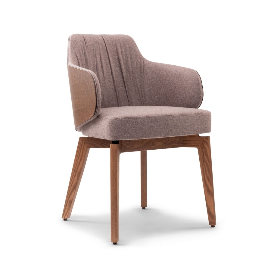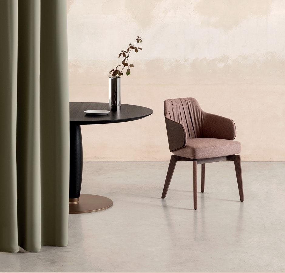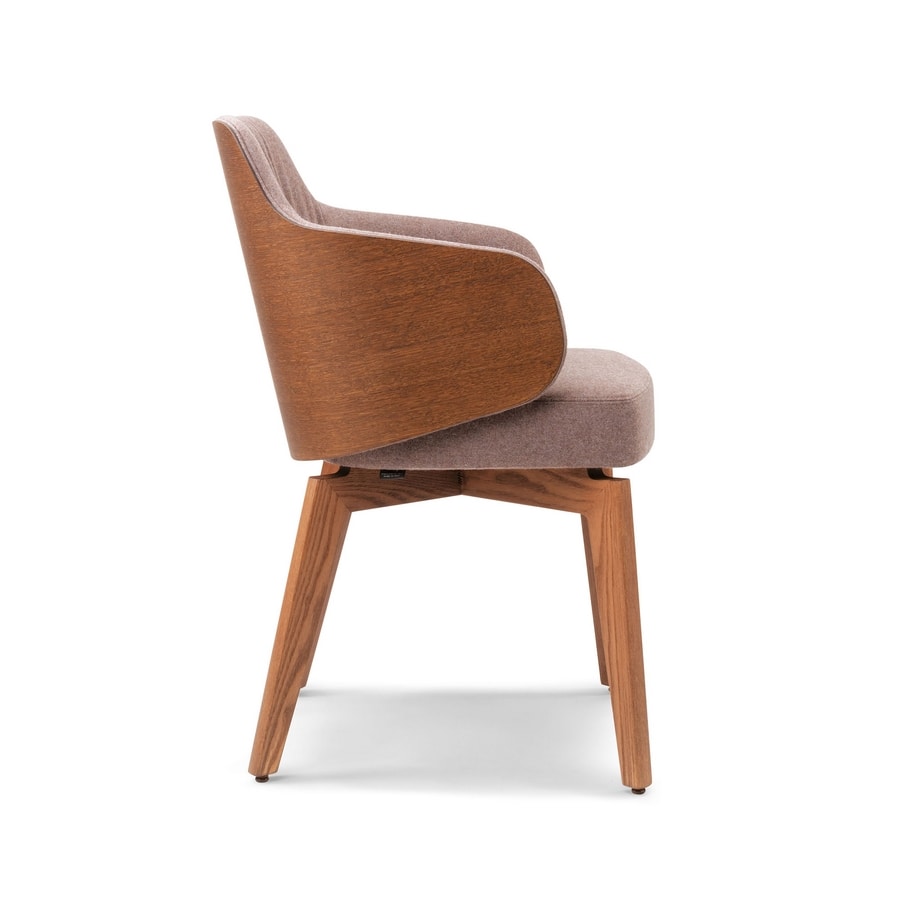 Mia offre una seduta dalle dimensioni generose e dalle diverse forme di schienale. Il design si ispira al settore ufficio, con il collegamento realizzato attraverso una lama metallica armonica. Questa soluzione consente una piacevole flessione quando ci si siede. Ogni variante di seduta include sia l'opzione con schienale imbottito sia quella con il dorso in legno di frassino spazzolato, consentendo una perfetta sintesi di comfort e versatilità.