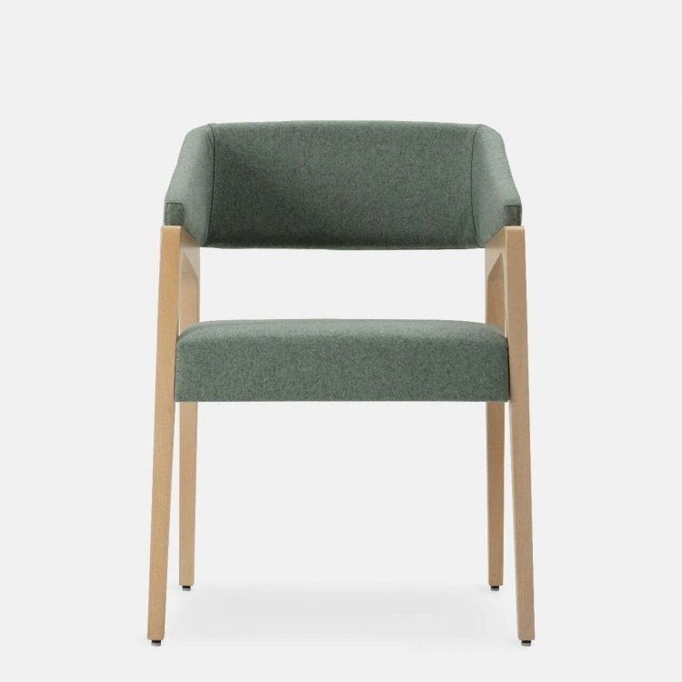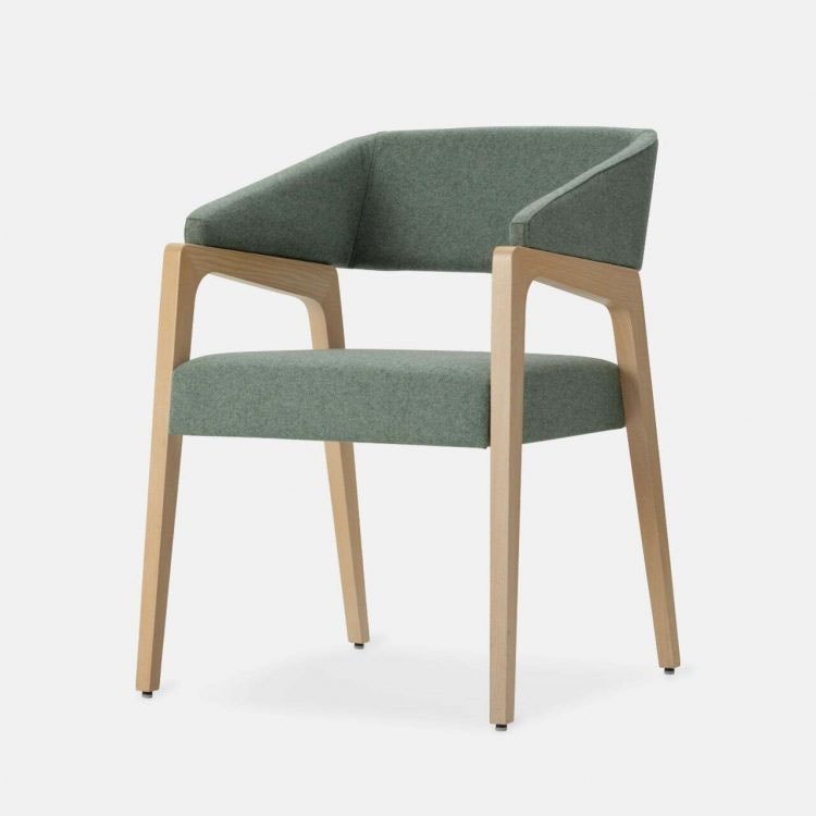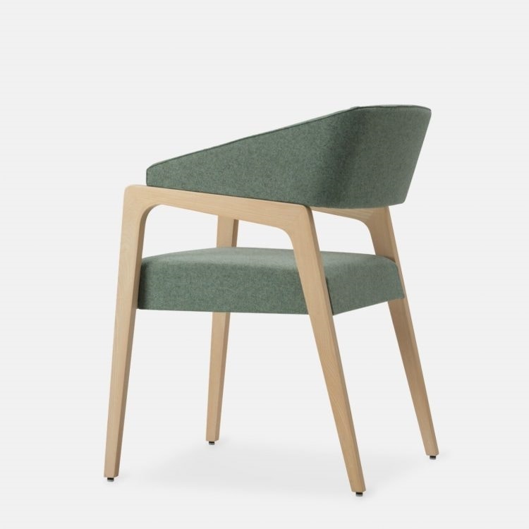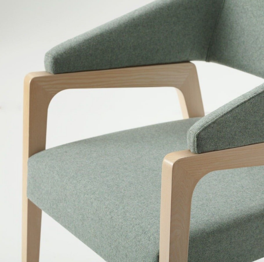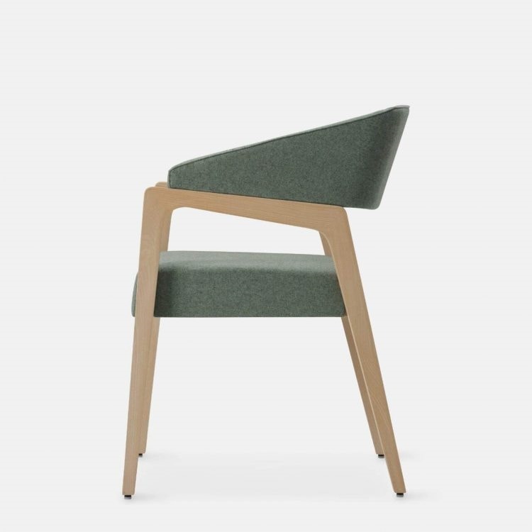 Musa ha una struttura in legno di frassino disponibile nelle nostre colorazioni standard o nelle finiture personalizzate. La seduta e lo schienale sono in espanso ignifugo, rivestiti con i nostri tessuti a scelta o in tessuto Cliente.