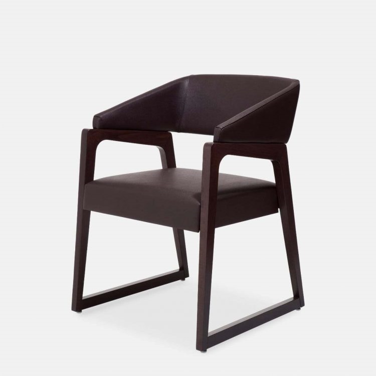 La poltroncina Musa colpisce per i suoi dettagli, come il comodo schienale che diviene un tutt’uno col bracciolo, le gambe a due a due, gli armoniosi abbinamenti di morbide imbottiture, in tessuto o pelle e solido legno.