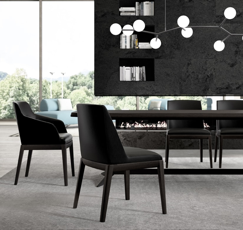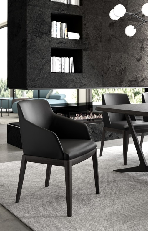 Tina e Tina arms sono due poltroncine da pranzo dai tratti decisi e contraddistinte da un’eleganza senza tempo. Sono disponibili rivestite in tessuto o pelle con un elegante basamento in legno. Qui sono proposte in un raffinato rivestimento in pelle nera, in abbinamento ad una finitura rovere termocotto per il basamento. Questo particolare abbinamento ne sottolinea il carattere deciso, donandole una precisa connotazione contemporanea.