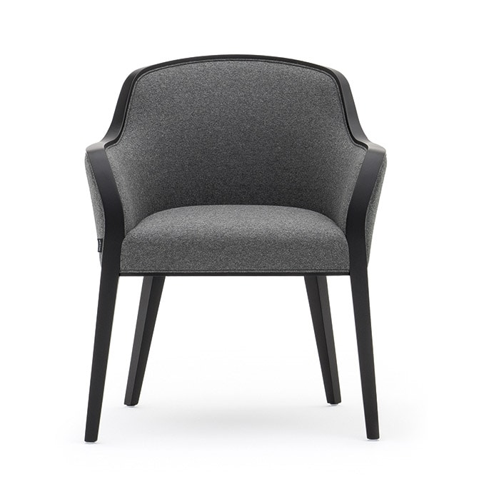 Collezione di sedute elegante e sofisticata. La sinuositā delle curve rende Wave pregiata sia dal punto di vista estetico che produttivo. Il binomio legno massello e pelle o tessuto č quanto mai raffinato, la lavorazione della tappezzeria le regala il fascino del dettaglio sartoriale.