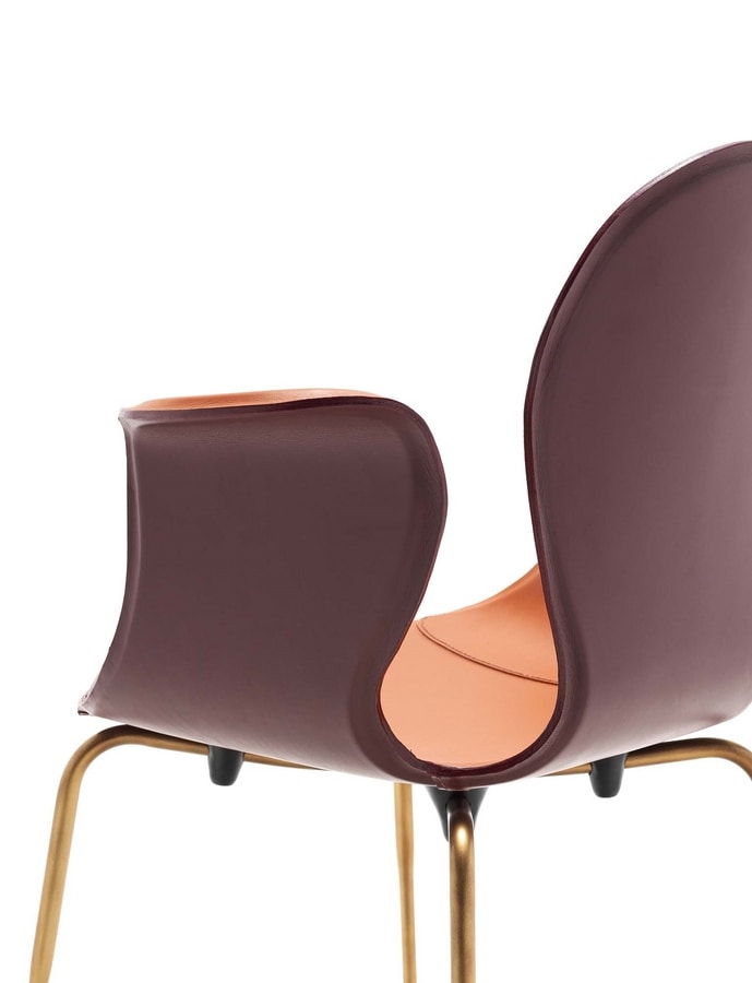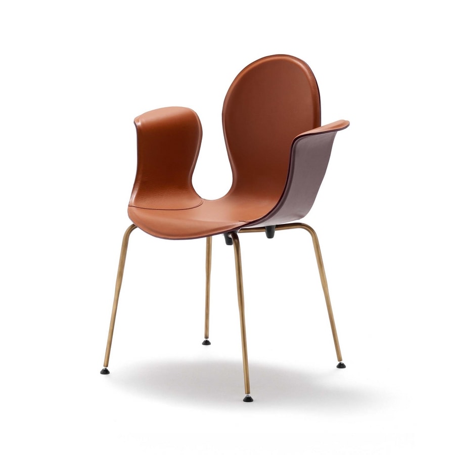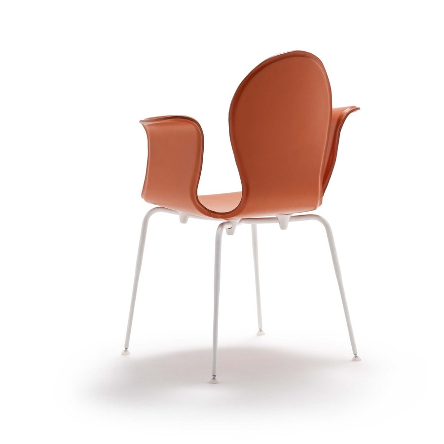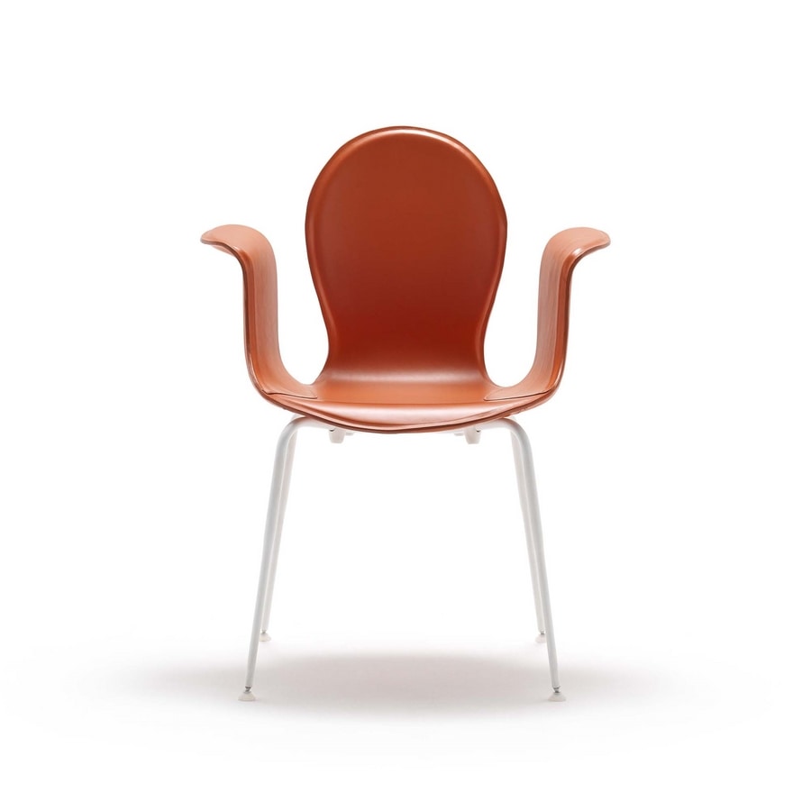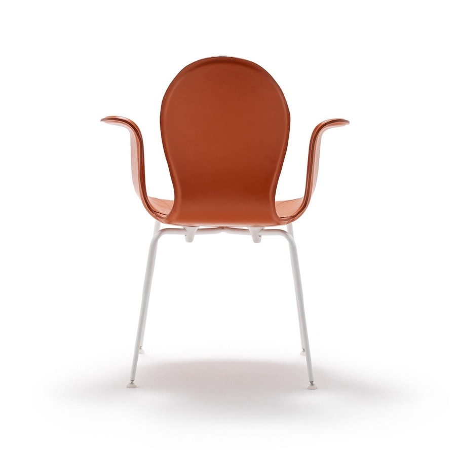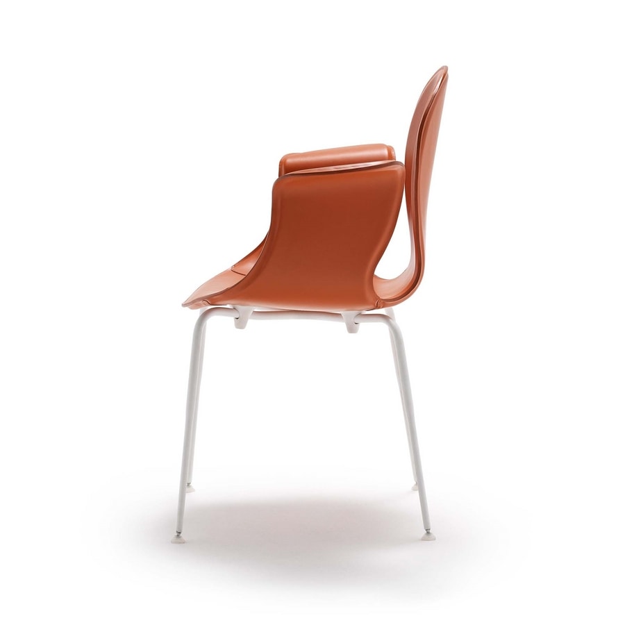 Poltroncina sinuosa, solida e leggerissima. Ha una scocca curvata in multistrato di faggio interamente rivestita in cuoio pieno fiore. Base fissa in acciaio con piedini inclinabili.