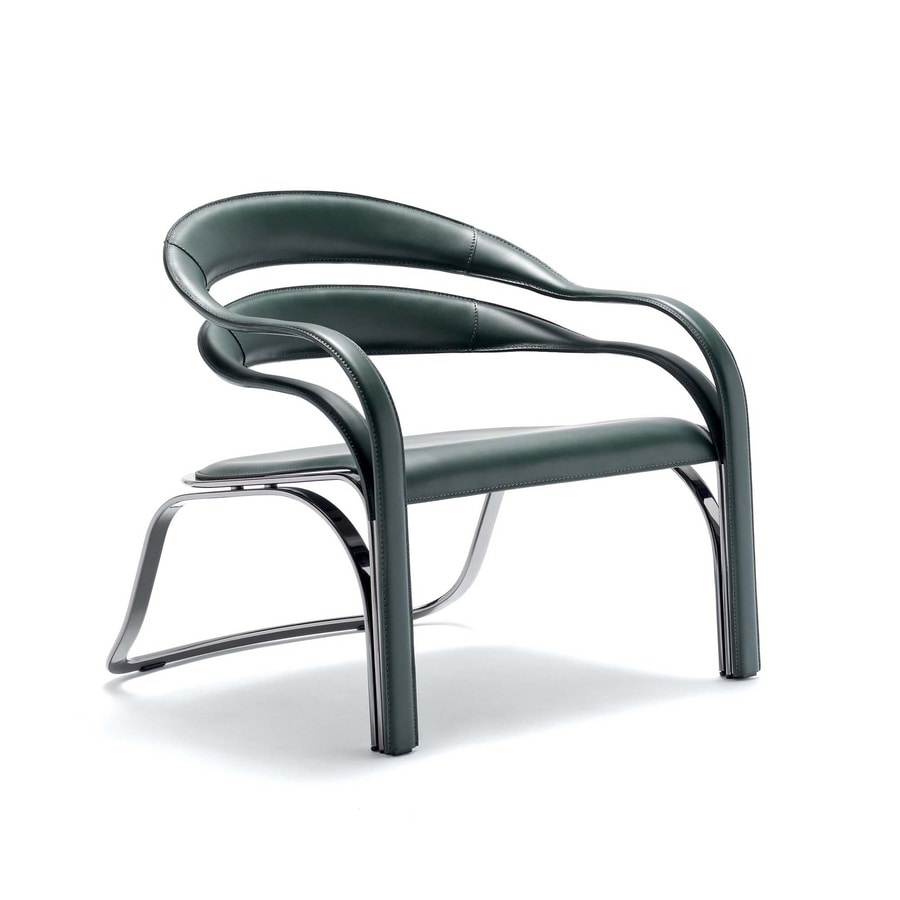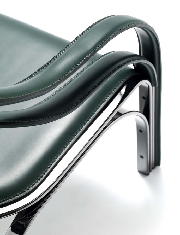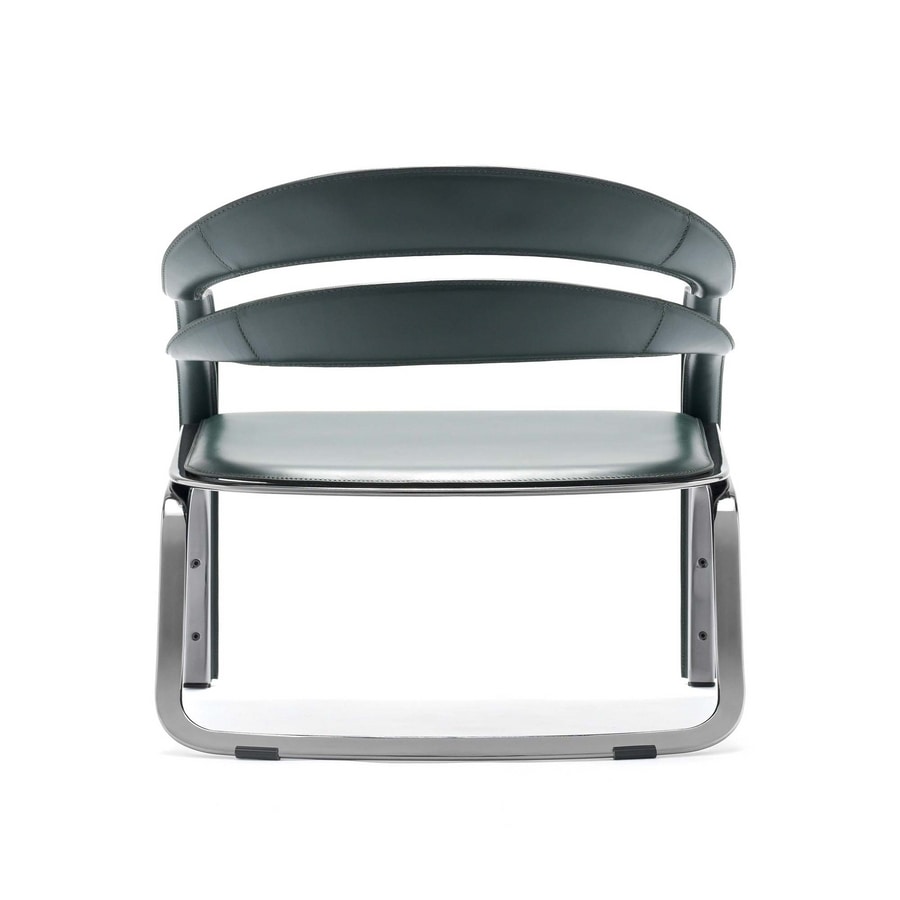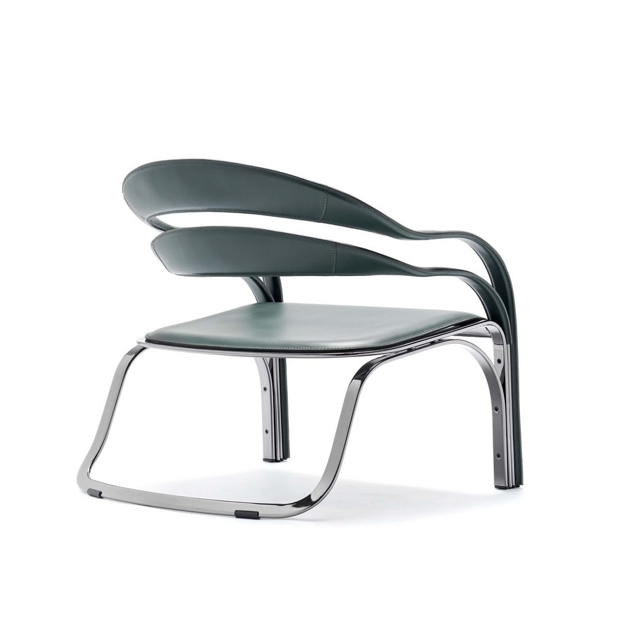 Poltrona con schienale flessibile a doppia fascia. Unica e con forte personalità questa poltrona può caratterizzare una zona living o uno spazio comune.