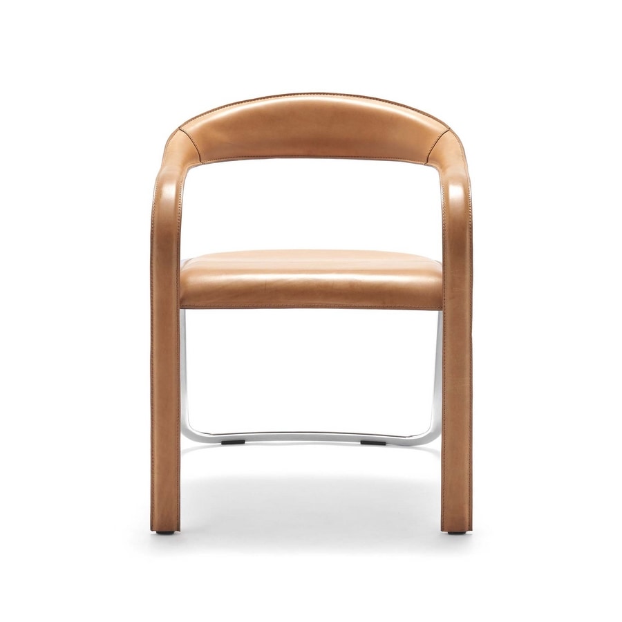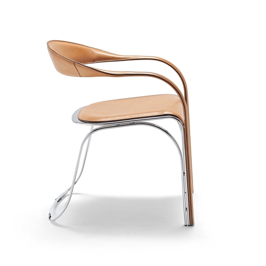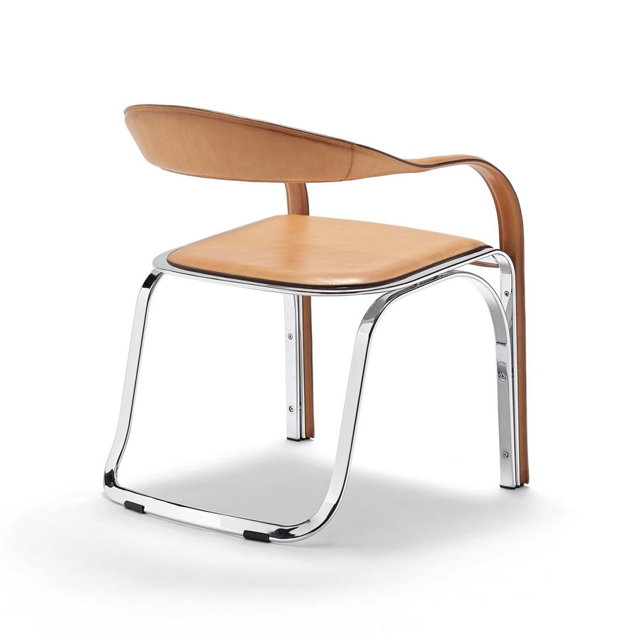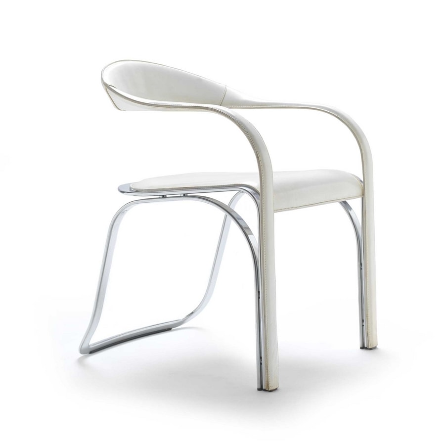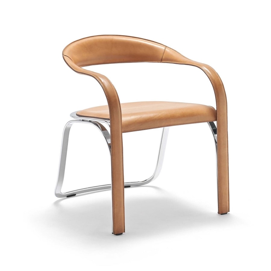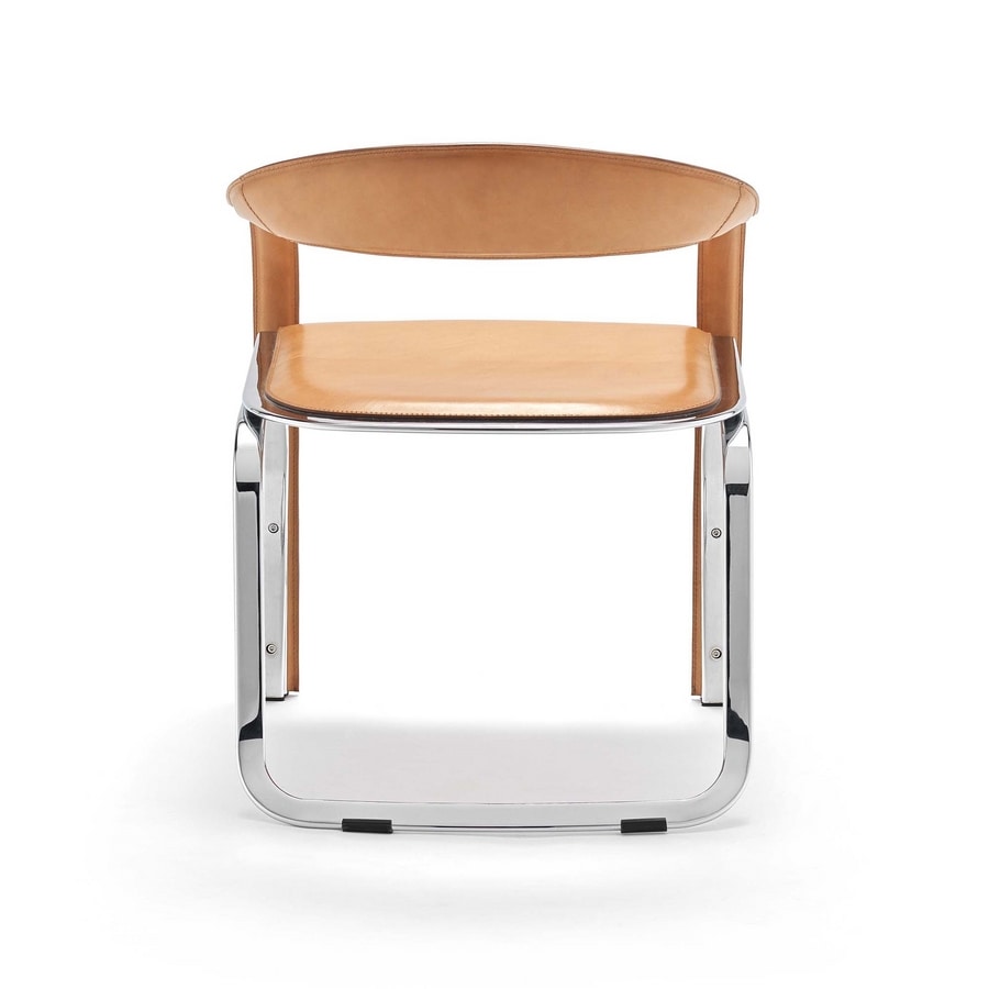 Un pezzo iconico dell’azienda. Quasi una scultura. Impossibile non riuscire ad apprezzarne il valore e la complessità nella realizzazione. Sedia con struttura d'acciaio cromato o verniciato. Rivestimento in cuoio.
