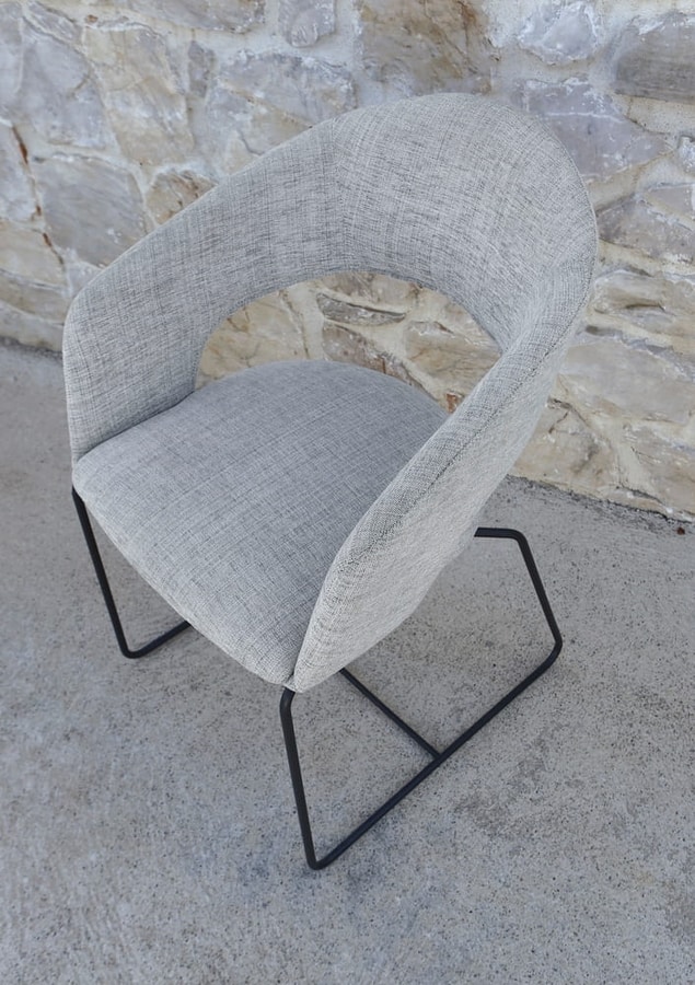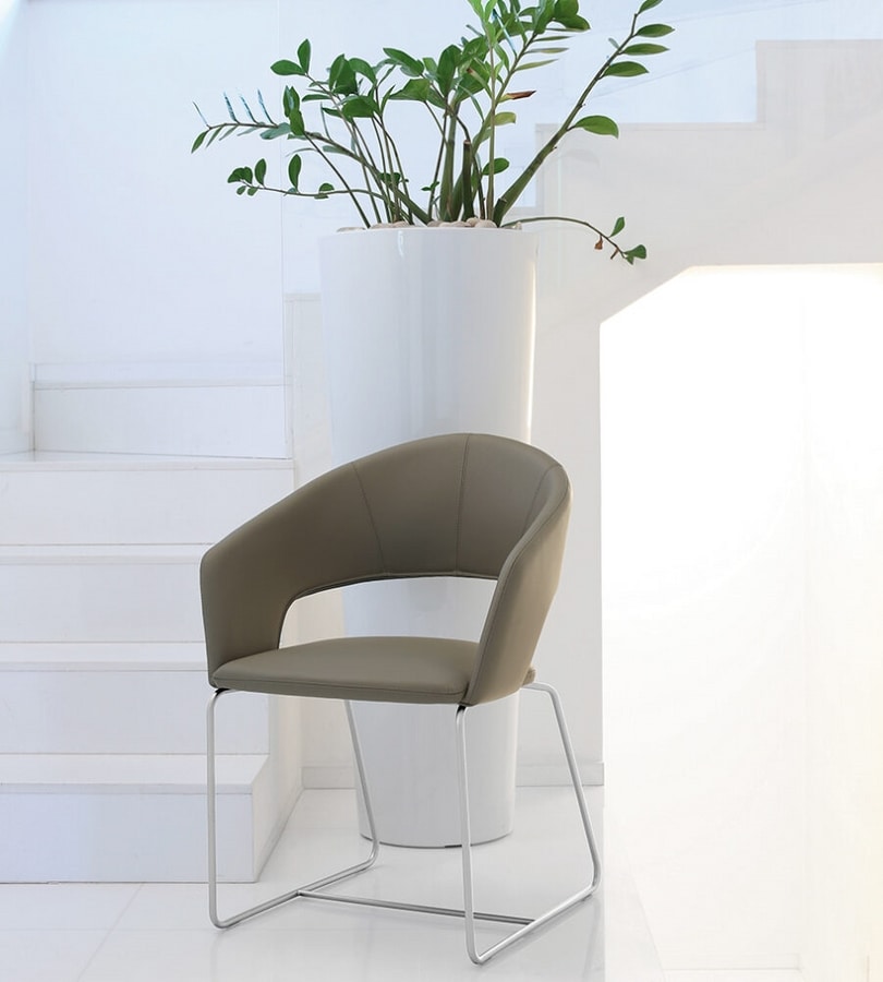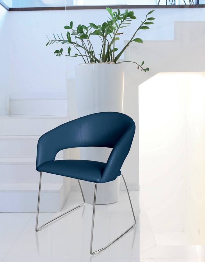 Sedia, struttura in acciaio, seduta rivestita in cuoio, pelle, tessuto o ecopelle. Il basamento in acciaio č disponibile cromato o verniciato.