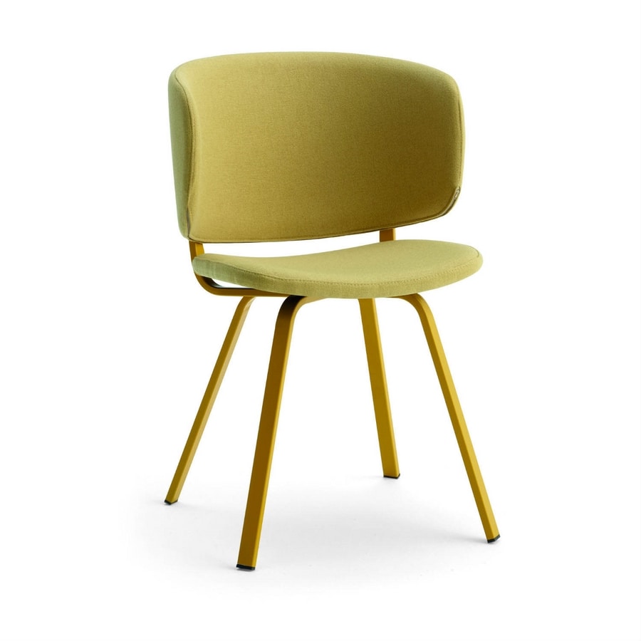 Poltroncina con struttura in metallo, sedile e schienale imbottito in ecopelle (tessuto spalmato) o in tessuto.