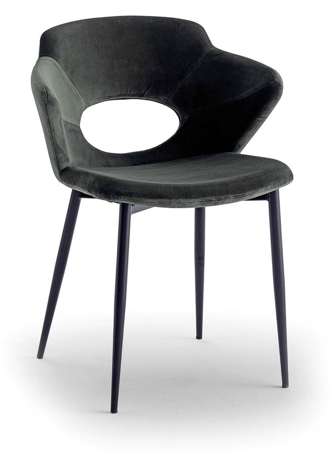 Poltroncina con struttura in metallo, sedile e schienale imbottito in ecopelle (tessuto spalmato) o in tessuto. Sedile e schienale schiumato (schiuma poliuretanica).