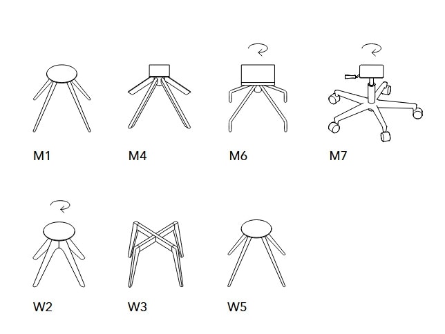 Poltroncina con imbottitura in poliuretano espanso; disponibili sette basi differenti, di cui tre girevoli, in metallo verniciato o legno con diverse finiture.