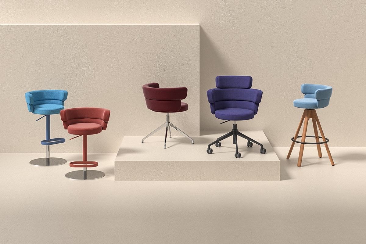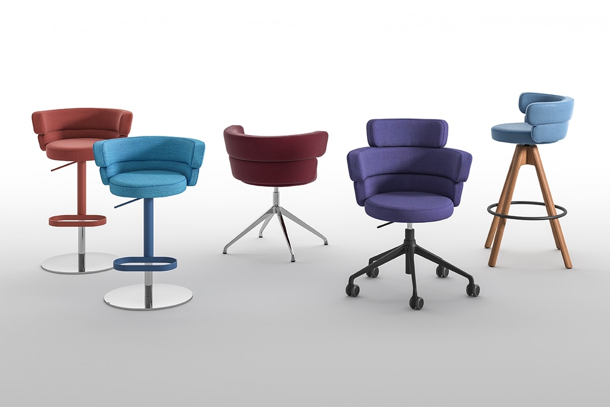 Dam è una collezione di sedute imbottite composta di poltroncine e sgabelli girevoli. Il sedile, tondo e ben imbottito, è avvolto dallo schienale a due o tre fasce sovrapposte che oltre a offrire un confortevole supporto lombare fungono da braccioli. La poltroncina è disponibile con base a trespolo, con o senza ruote piroettanti, mentre lo sgabello girevole è fornito con base regolabile in altezza in acciaio inox satinato e poggiapiedi cromato o verniciato, oppure con base in legno.