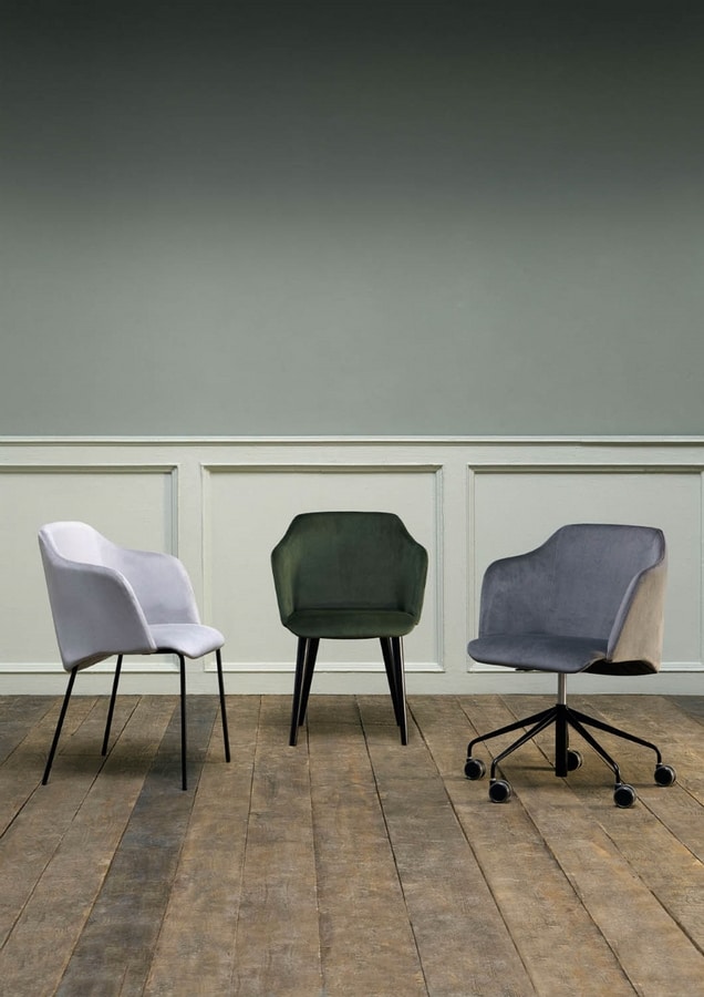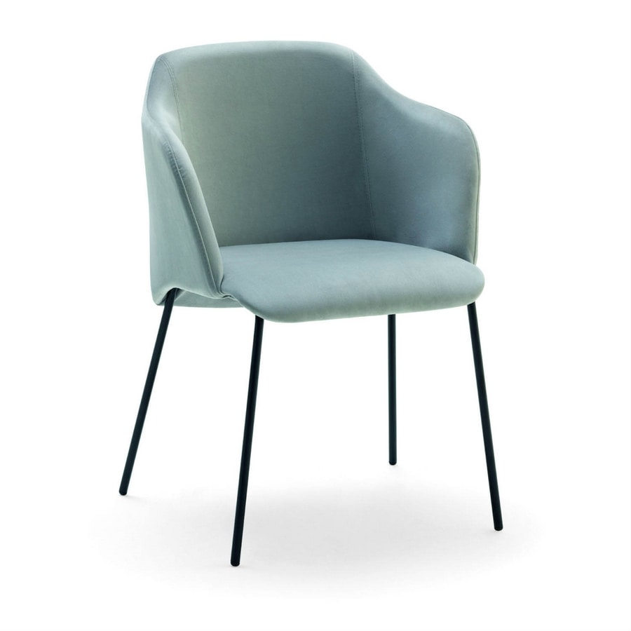 Poltroncina con struttura in metallo, sedile e schienale imbottito in ecopelle (tessuto spalmato) o in tessuto.