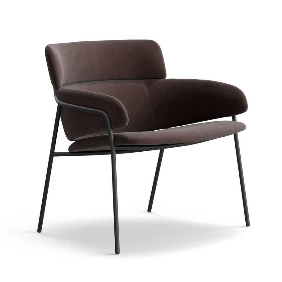Un sottile tubo d’acciaio verniciato abbraccia un doppio schienale imbottito, rivelando i dettagli che determinano l’unicità della collezione per l’ospitalità che unisce eleganza leggerezza e resistenza. Sedile e schienali sono tappezzati artigianalmente con gomme ignifughe certificate e