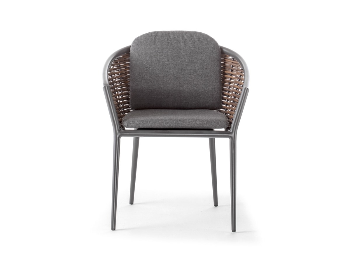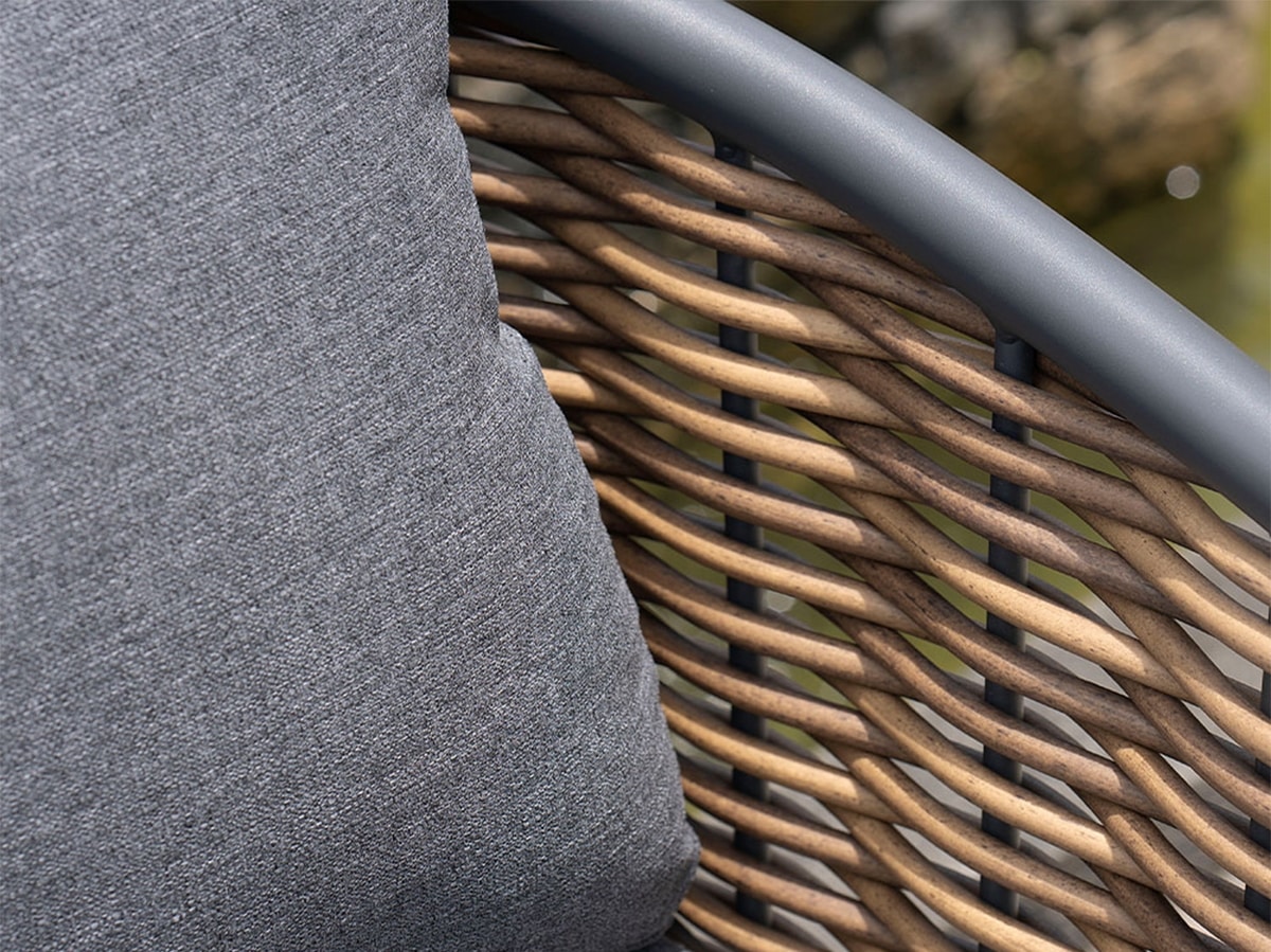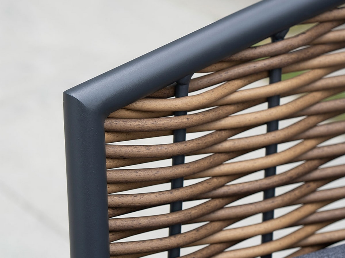 La corda sintetica Wintech Antracite, delicatamente intrecciata attorno alla struttura, conferisce un tocco di sofisticatezza, trasformando Vieste in un'ode all'eleganza leggera, ideale per trasportarti in un mondo di puro piacere all'aria aperta.