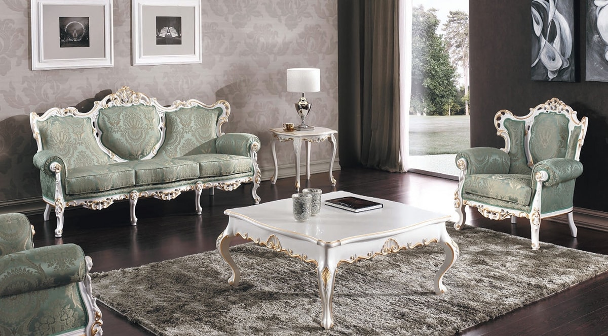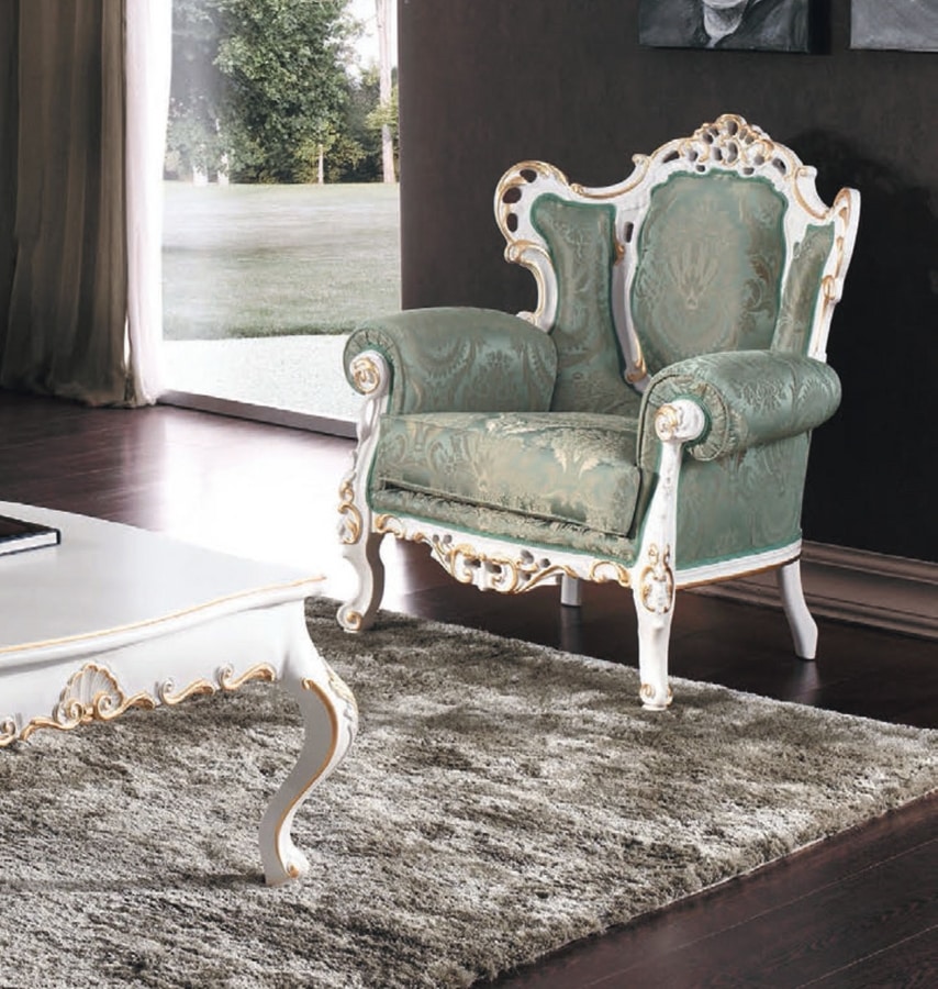 Poltrona Medaglione rivestita in tessuto. Struttura in legno minuziosamente intagliato, finitura laccato bianco con dettagli oro.