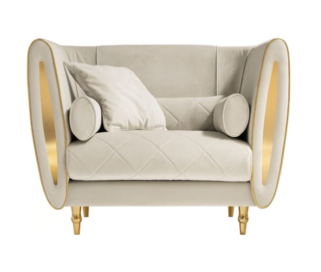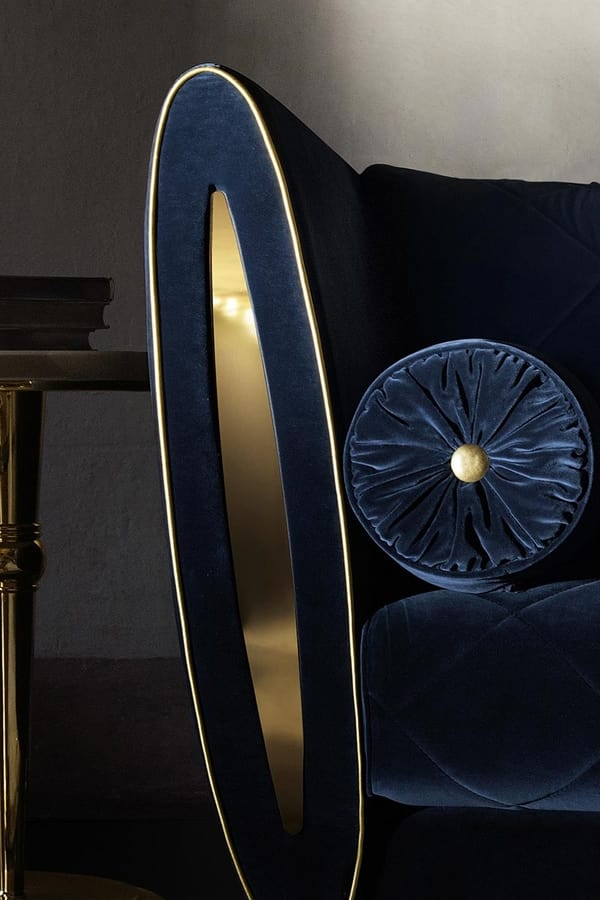 Le poltrone della collezione Sipario hanno una linea sintetica e raffinata. Le sedute sono ampie e profonde ed equilibrano la linea continua dello schienale che prosegue, in una curva morbida, per diventare bracciolo. Una continuità del segno che le rende compatte e adatte a svariati contesti, da soluzioni tradizionali fino a giochi di contrasti più intensi, sfruttando l’elemento contemporaneo dell’ellisse in ottone che ne caratterizza il bracciolo. Le poltrone si impreziosiscono poi di morbidi cuscini che, oltre ad assolvere a un aspetto strettamente funzionale, diventano a loro volta elementi decorativi come nel caso del cuscino che circonda la seduta e che crea un piacevole contrasto con i toni dorati del cuscinetto quadrato.