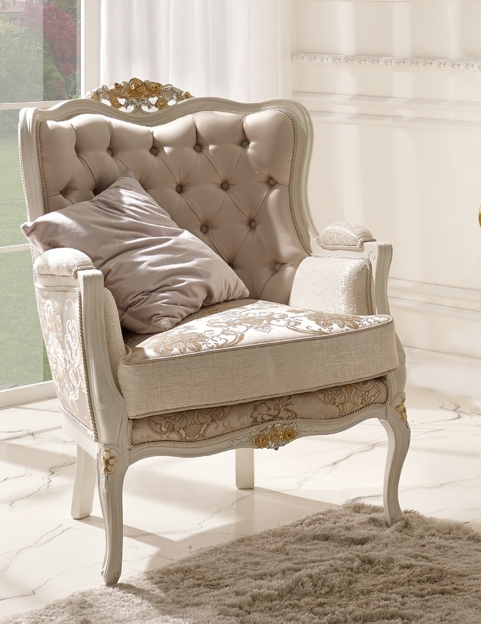 Poltrona in stile classico, con struttura in legno. Schienale con imbottitura capitonné. Con intagli decorativi.