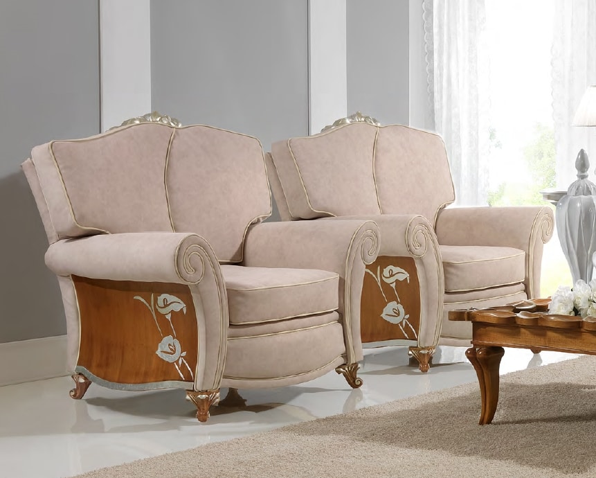 Poltrona dal design classico, con rivestimento in ecopelle. Piedini e fianchi in legno noce, con decori floreali argento.